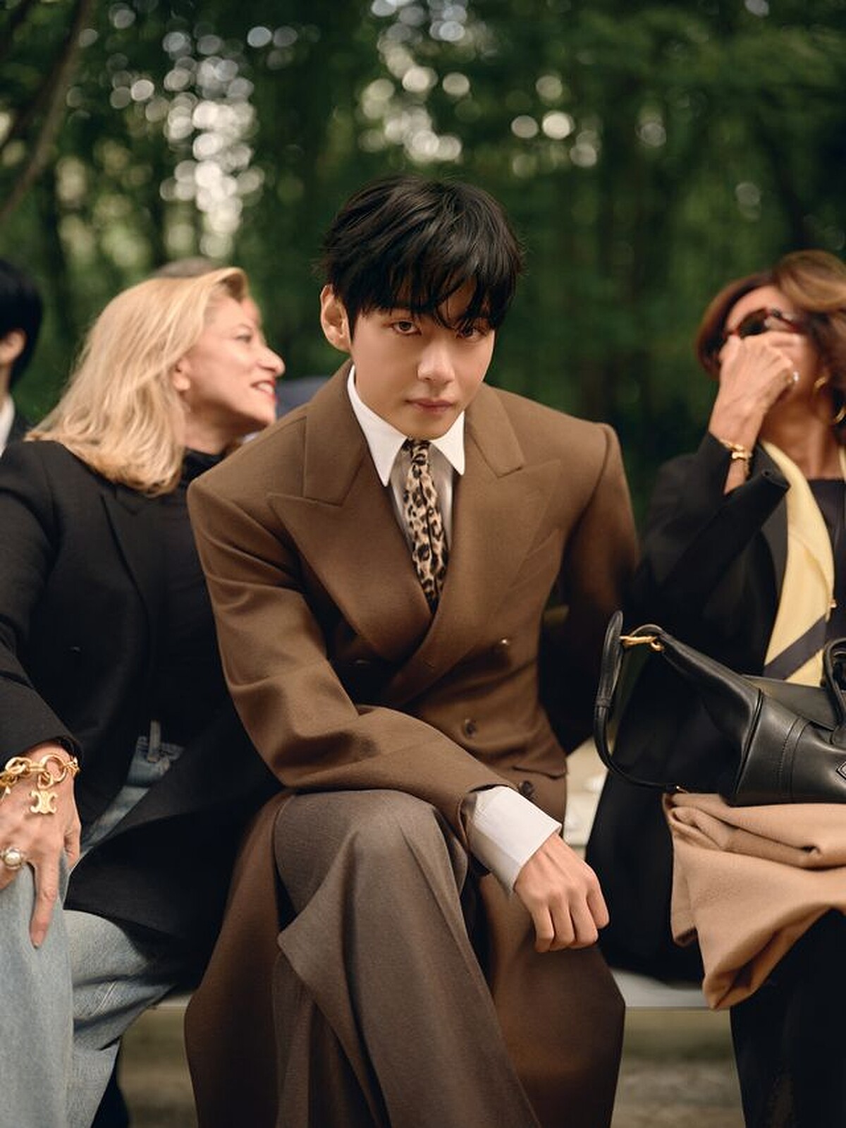 而在進入大秀解析前,本季一大重點不外乎是全球品牌大使:BTS V 金泰亨,當 V 現身秀場時,他以一身焦糖棕大衣造型登場,也與女神影星烏瑪・舒曼(Uma Thurman)優雅同框,兩人之間的畫面猶如一場關於極簡與奢華的對話。