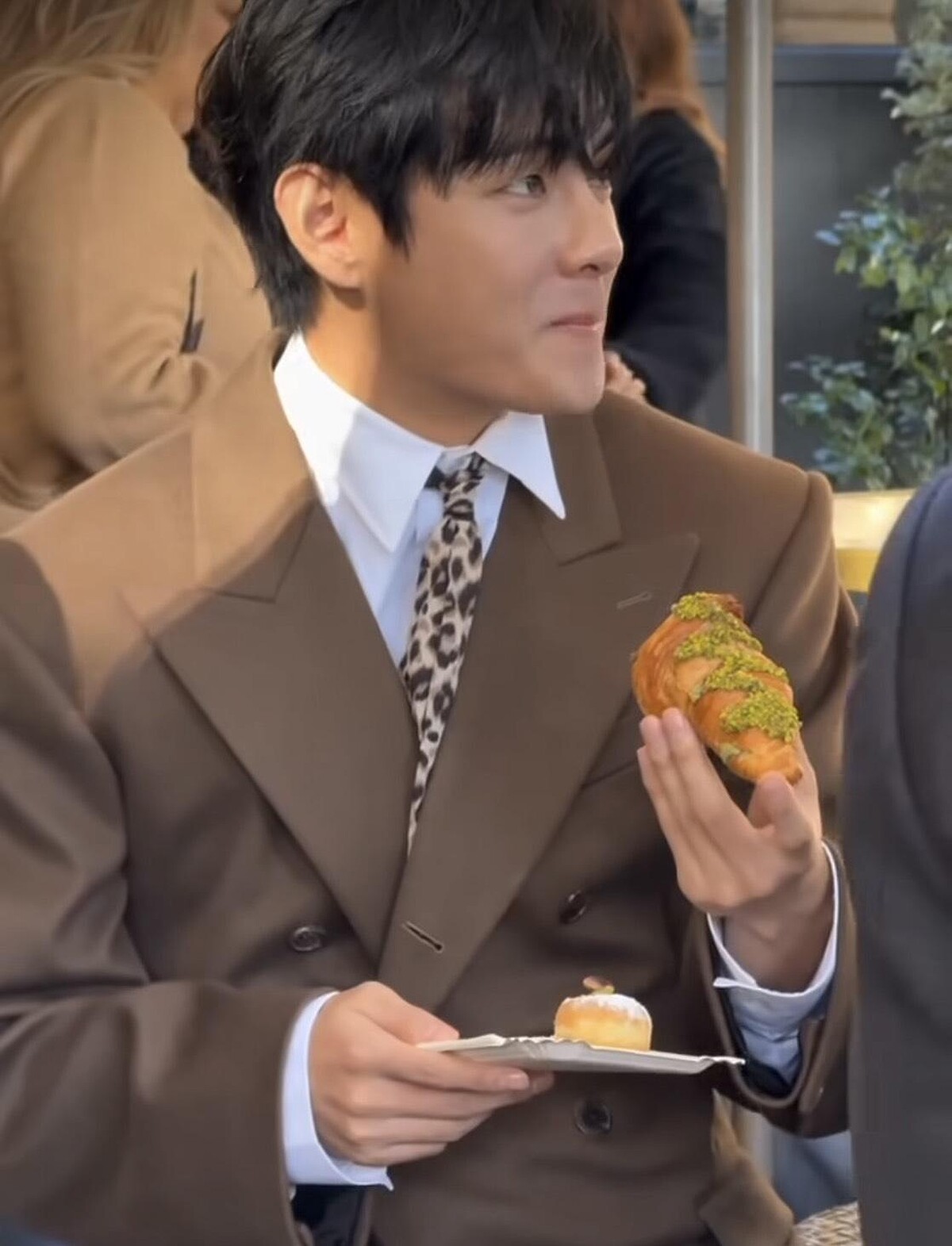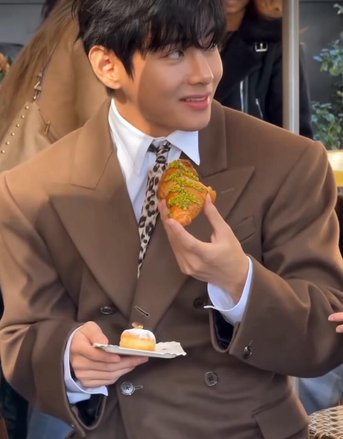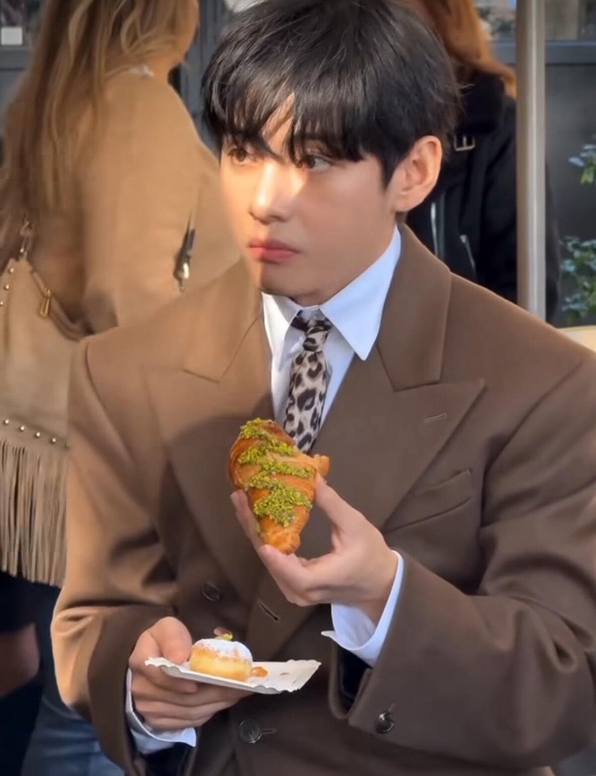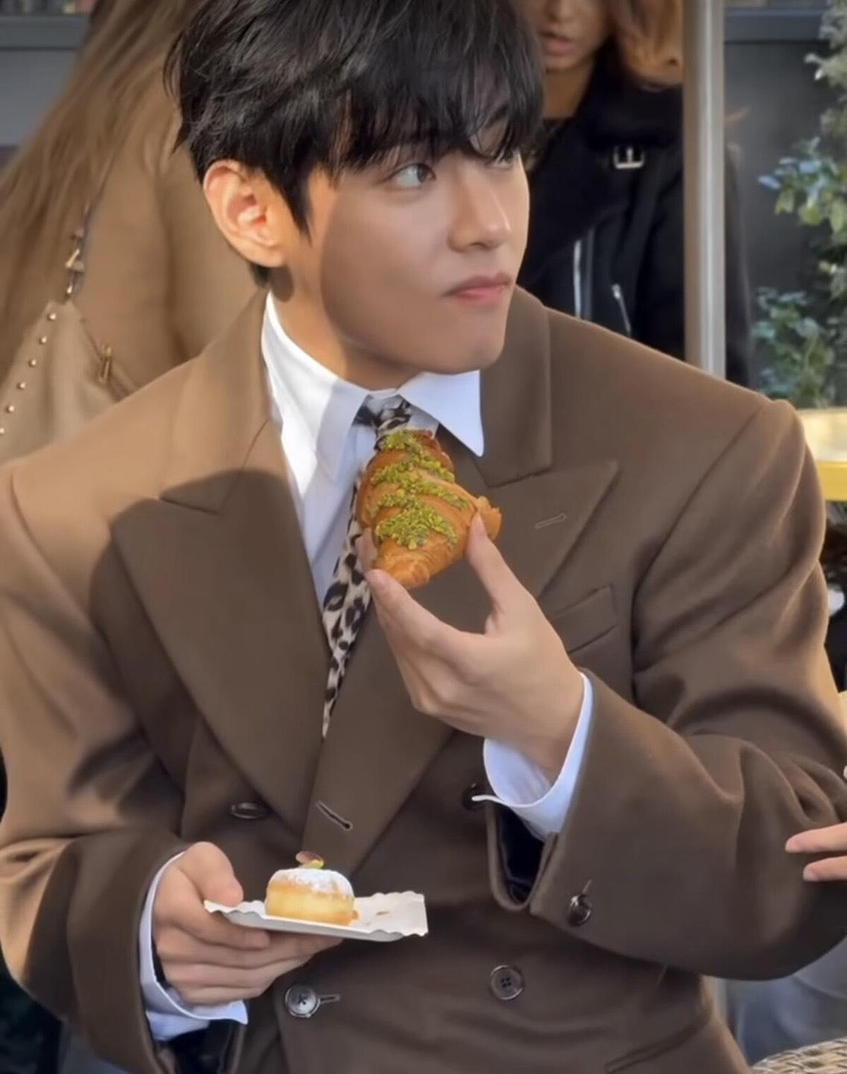 另外,近期在社群上有著極高討論的,V 手裡拿著開心果口味可頌,保鑣則貼心端著他的開心果冰淇淋,這一幕自然又不失風格!