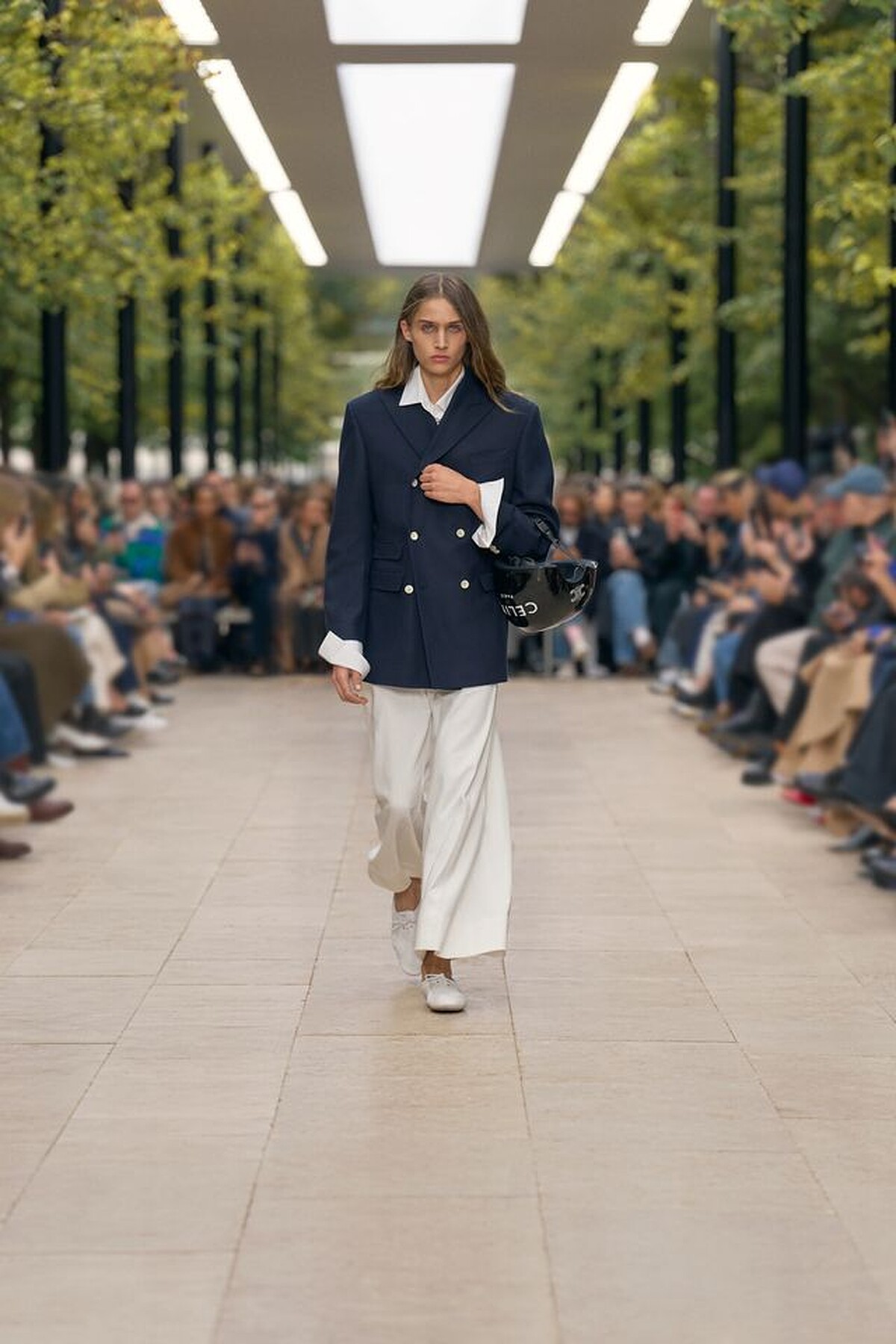 本季中聚焦時髦精目光的,還有模特兒手持安全帽、拎著大草編包出場的那份衝突趣味,回應了設計師想表達的生活日常,年輕人總是拿著安全帽上班的生活景象,這是一種自由且無拘束的符號表述,不造作且真實,也是屬於 CELINE 的巴黎生活感。