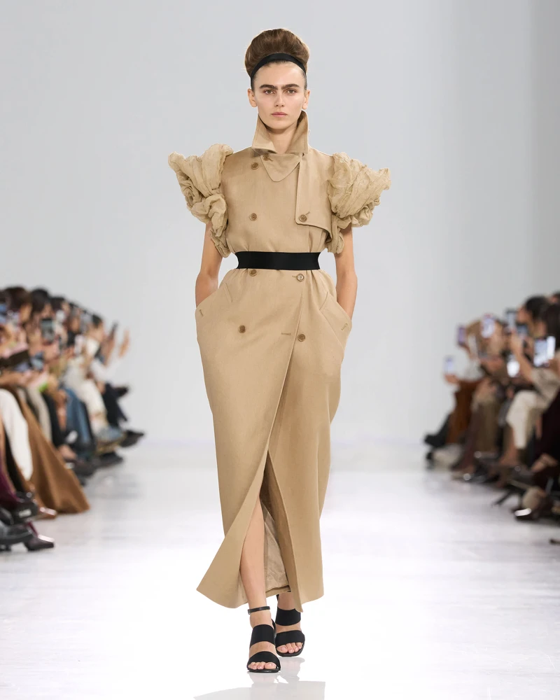 一向擅長在各領域出色女性中尋找靈感的 MaxMara ,在2026春夏系列將眼光瞄準了來自法國的龐巴杜夫人,將這位洛可可女王的風格延伸到本季的伸展台。開場的風衣肩膀摺得像金色羽翼,接續著印花歐根紗裙,與灰色系套裝,在這其中搭配上黑色腰封、馬具背帶還有實用鞋包,瞬間又多了點帥氣和力量,總體來說,幹練又浪漫這兩個看似平行線的詞彙,在本季有了完美的交集!