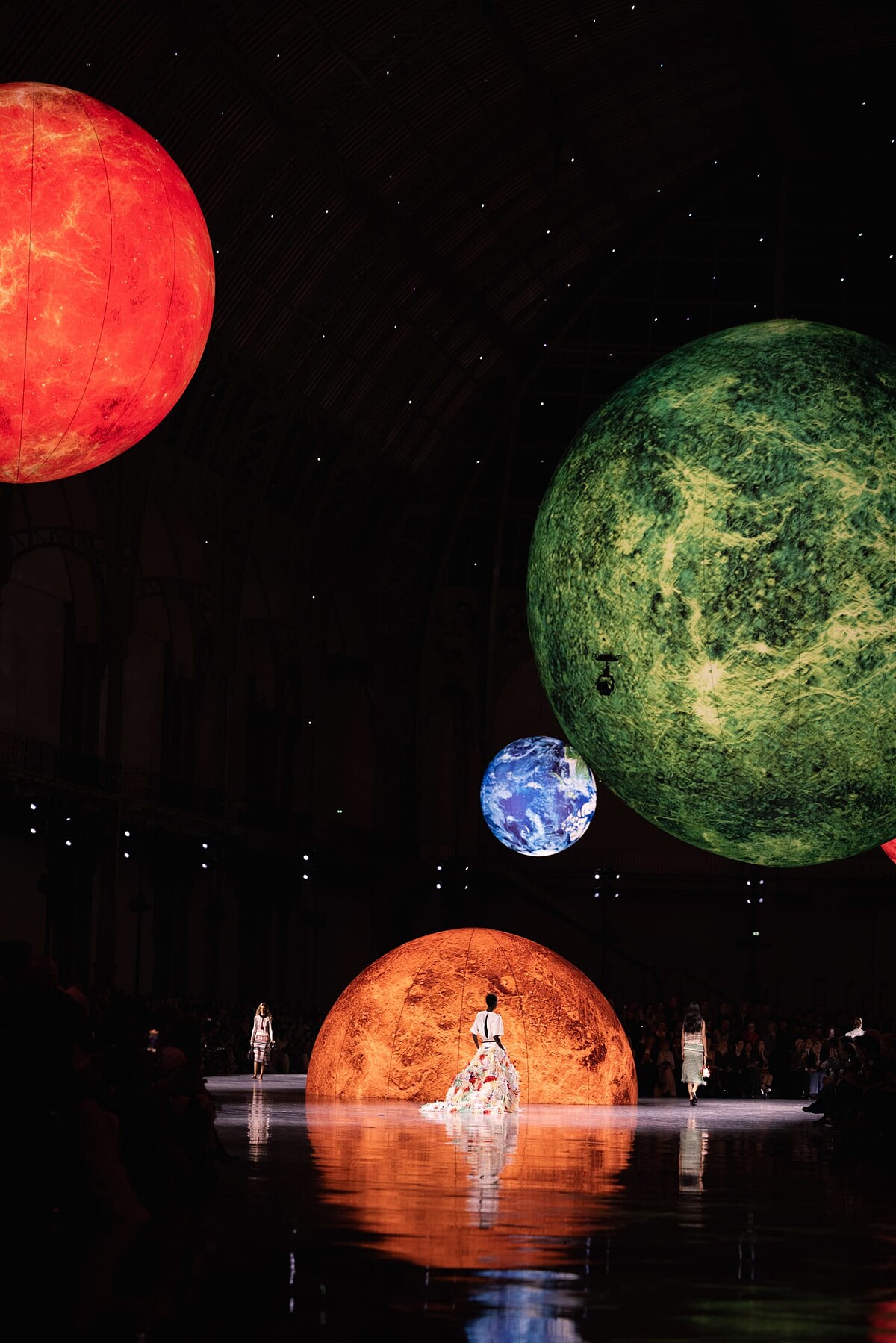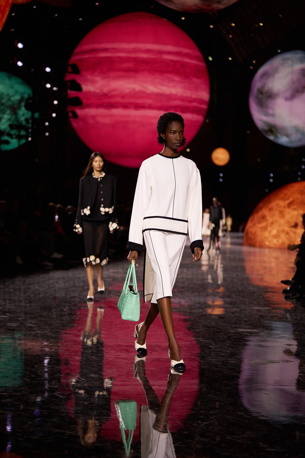 這場秀恰逢2026春夏巴黎時裝週的閉幕。走入大皇宮那恢宏的空間,觀眾幾乎屏住呼吸。火星、金星與地球懸浮於半空,光線如潮水般流動。現場坐滿了許多重量級的人物,從編輯、造型師、攝影師與品牌摯友。而最前排的香奈兒大使們,包含最新任的Nicole Kidman、Jennie、Margot Robbie、Becky皆身著黑白色調共享盛舉這場具有歷史性的一場大秀。