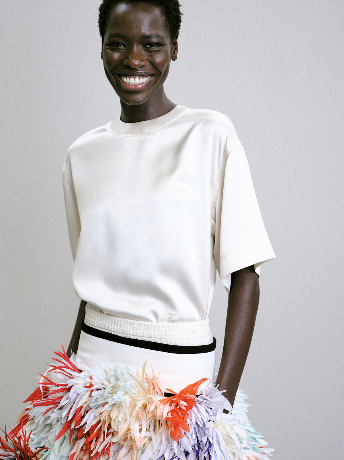 閉幕的新世代超模Awar Odhiang身披一件彩色羽毛裙,旋轉、鼓掌、露出笑容,打破了伸展台上的高冷距離,Matthieu Blazy走上舞台,與他在星光之下相擁。這一刻,不僅象徵著香奈兒新時代的誕生,也宣告了新一代超模力量的崛起。