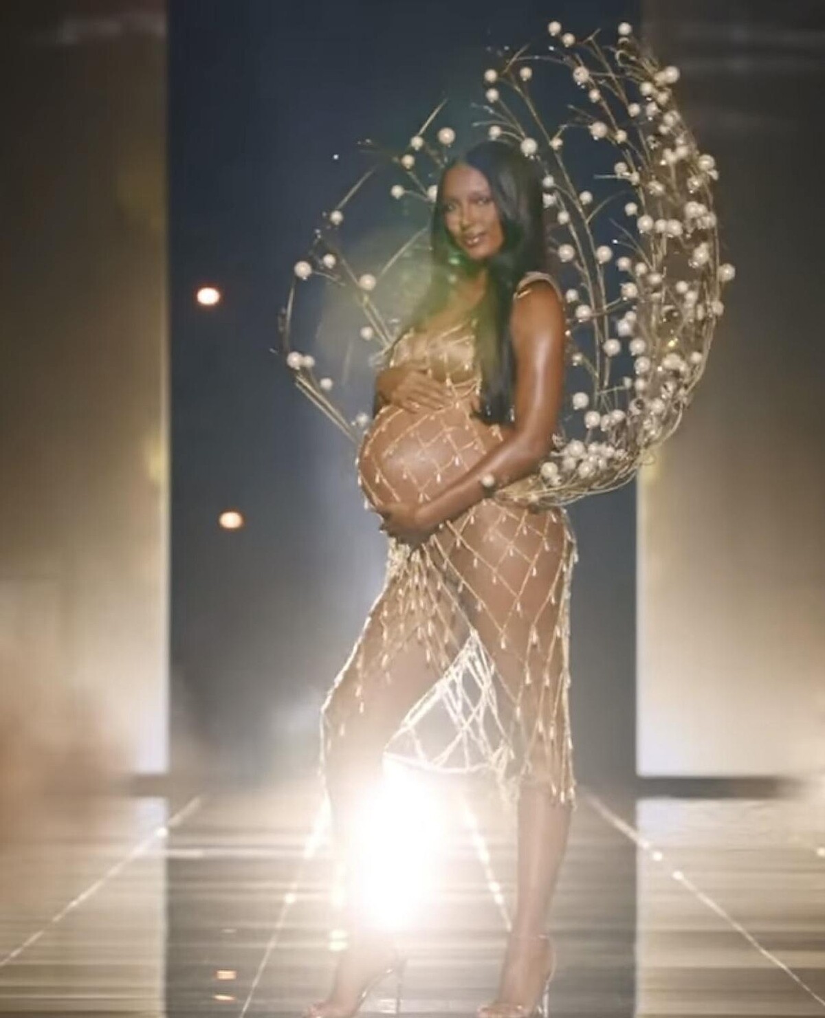 2025年Victoria’s Secret大秀的開場也非常令人震撼,當維密天使Jasmine Tookes以懷孕九個月的狀態,挺著孕肚走上舞台,穿著閃耀的金絲禮服、金絲貝殼羽翼,背後如星雲般綻放光芒。這一刻不只是令人動容的美麗,更是對女性力量的禮讚。Jasmine Tookes用最柔軟的姿態詮釋最堅定的美,讓性感不再局限於身材的線條,而是延伸為一種生命力的存在。Jasmine Tookes的登場,是對「母親也能是超模」最有力的宣言,同時也改寫了伸展台的定義。