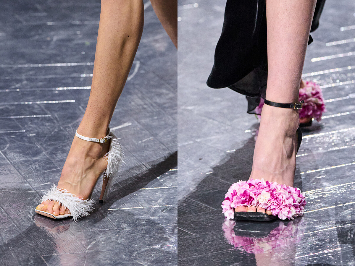 這種對真實與虛構之間界線的玩味,延伸至鞋履與珠寶之中。鞋履設計以 Roger Vivier 曾為Dior 打造的微翹方頭為靈感基礎,再加以當代轉化。Johnathan Anderson 也將絲質粉色仙客來花瓣鑲嵌於鞋面,延伸本季的花卉語境。