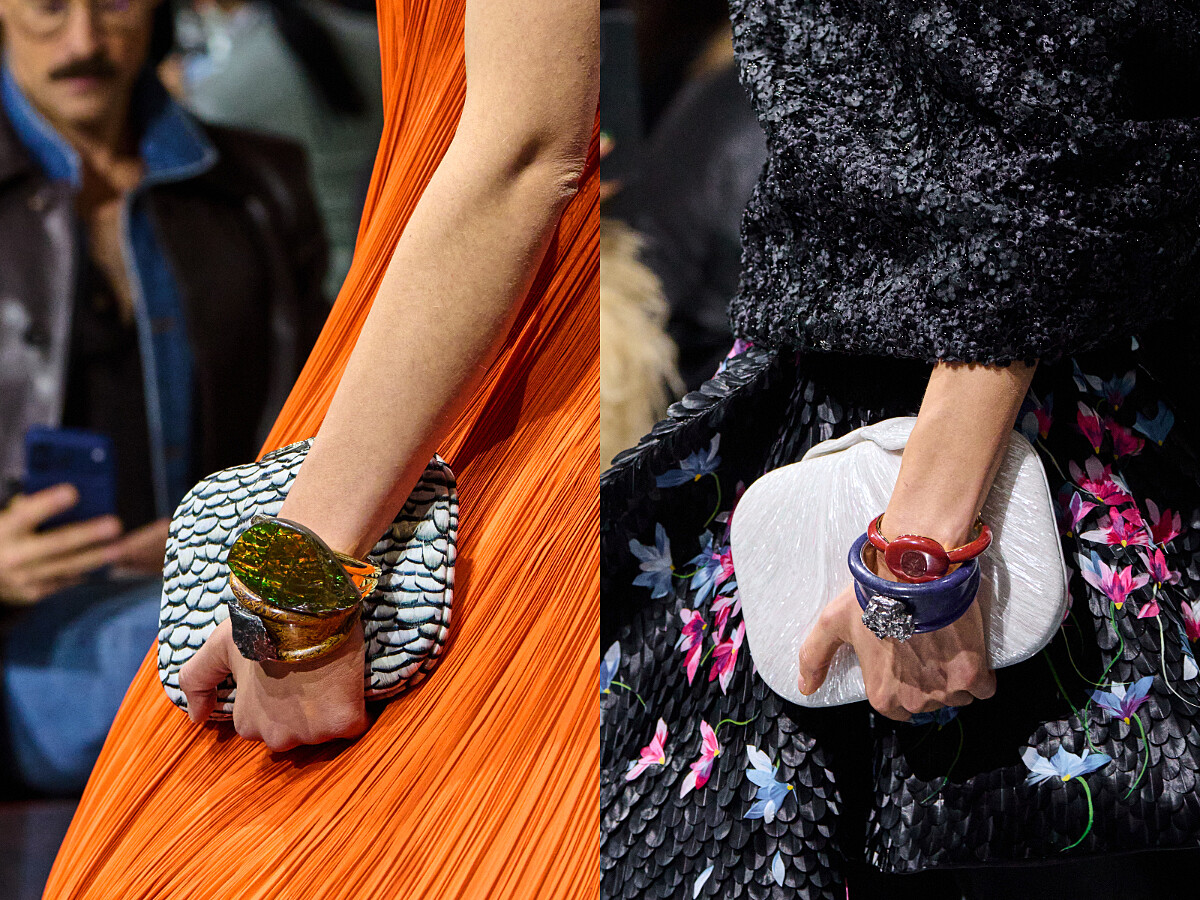 在配件設計上,Jonathan Anderson 同樣將「真假」作為創作母題。超寫實的花朵,以絲綢或琺瑯製成;蝴蝶與花的影像被不斷放大,直到它們變得抽象。正如他所說:「當你放大或縮小,它們會變成別的東西。它們可以極美,也可以極醜。」