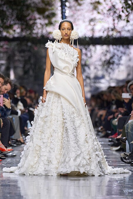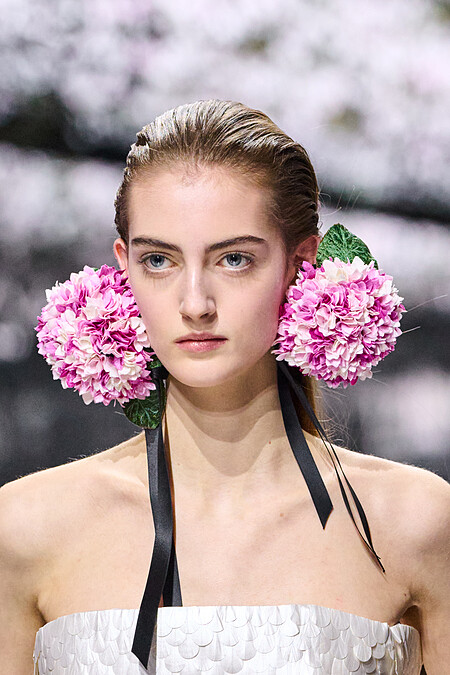 淡紫色花卉製成的巨大耳飾,為本次大秀作為首場開場,而這充滿標誌性的花卉語彙,貫穿了整場高訂大秀。Look 8 白色不規則荷葉邊造型的短洋裝,以布料模擬花瓣邊緣的自然起伏與垂墜感,讓模特宛如一朵行走中的花。鞋履上同樣點綴仙客來花朵,延續花卉語境的整體敘事。Look 10黑色垂墜長禮服以不對稱扭轉的垂墜布料構成,絲絨提花印滿仙客來印花。而Look 44更是將粉色絲綢仙客來花瓣鋪滿整件無肩帶洋裝,其廓形呼應 1949 年春夏的 Miss Dior 洋裝,在歷史與當代之間完成一次優雅對話。