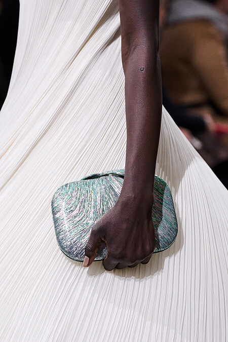 白色與橘色的雕塑感洋裝接連登場,近乎氣球狀的輪廓,以輕盈的絲質薄紗與金屬線構成,線條不再只是包覆身體,而是像陶土一樣,被塑形、被推擠、被延展。圓潤卻不僵硬,有體積,卻始終保有空氣感。以「陶土塑形」為語彙的高訂輪廓,為本次視覺語言定下基調。