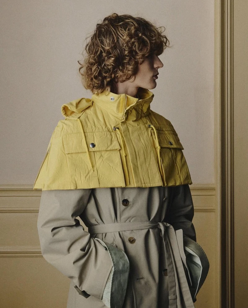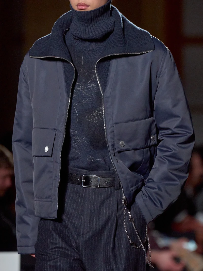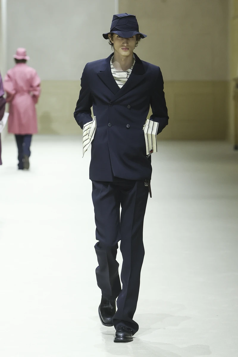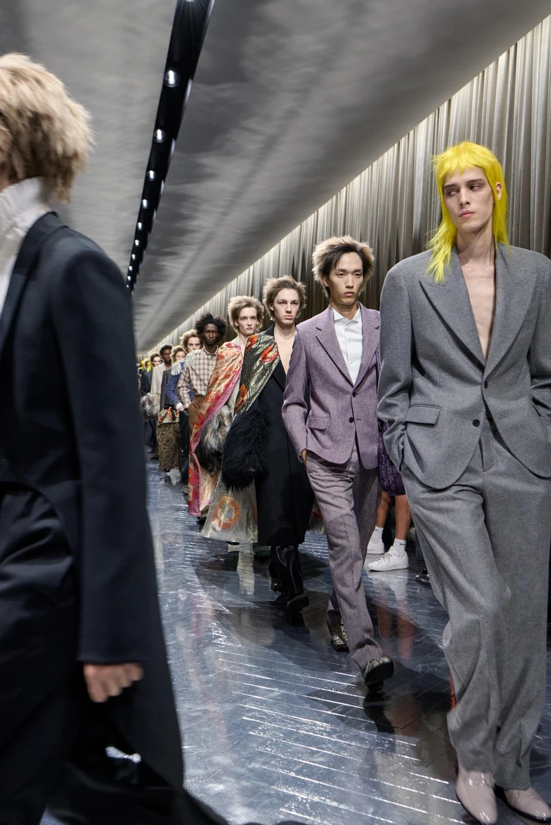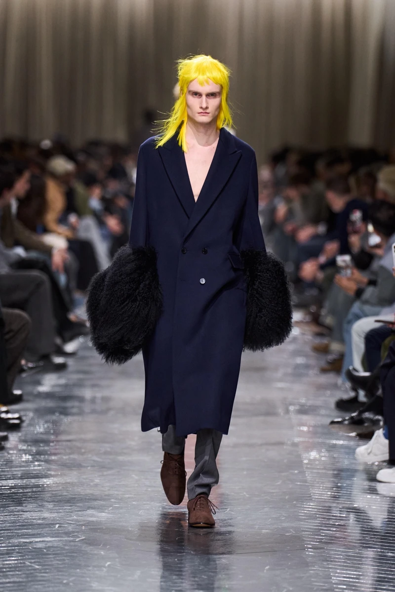 Miuccia Prada與Raf Simons本季持續探討人與服裝的距離,全新男裝系列的線條明顯拉長收窄,讓服裝更貼近人體形狀,服裝結構被簡化,使人意識到內在,外表看似純粹,實則在製作與構成上極為複雜。包括被拉長的襯衫、毛衣袖口,與大衣層疊搭出碰撞感,是本季男裝的制服公式。而在大衣外頭,另外罩上的一件半截的機能風格披肩,不僅成為大玩撞色的媒介,也再次凸顯不同風格的混搭實力。