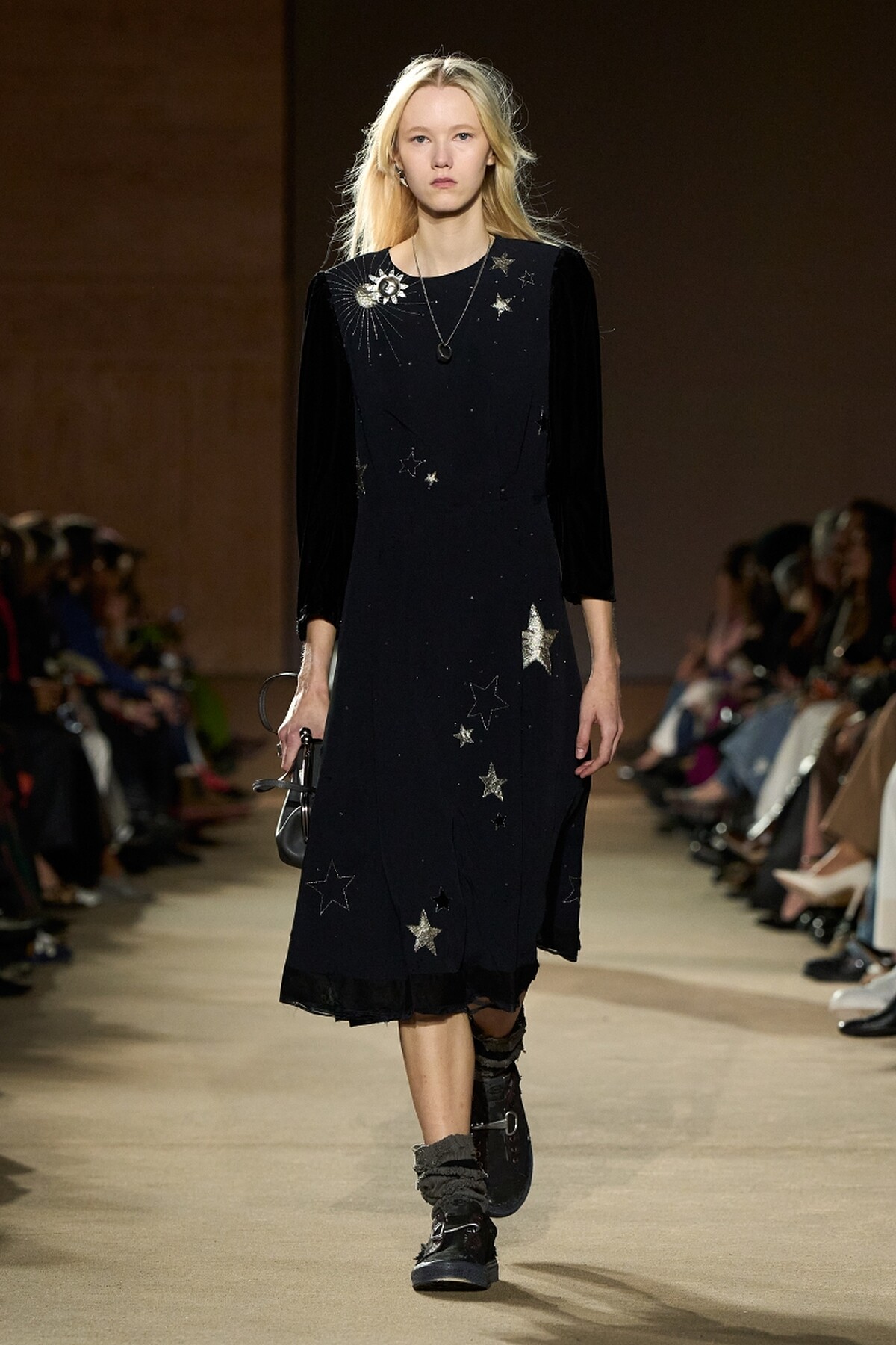 在強調日常與街頭風格的時代,Coach反而重新挖掘了「盛裝打扮」的樂趣,靈感來自1930與1940年代好萊塢的晚禮服,強調收腰線條與肩部結構,搭配鏤空設計與閃亮貼繡細節,在荷葉立領與長袖的設計呈現之下,帶著既古典又頹廢的氣息,這也是Coach 2026秋季系列很有意思的姿態,在大量滑板與學院元素之外,保留了高級時裝的戲劇性。