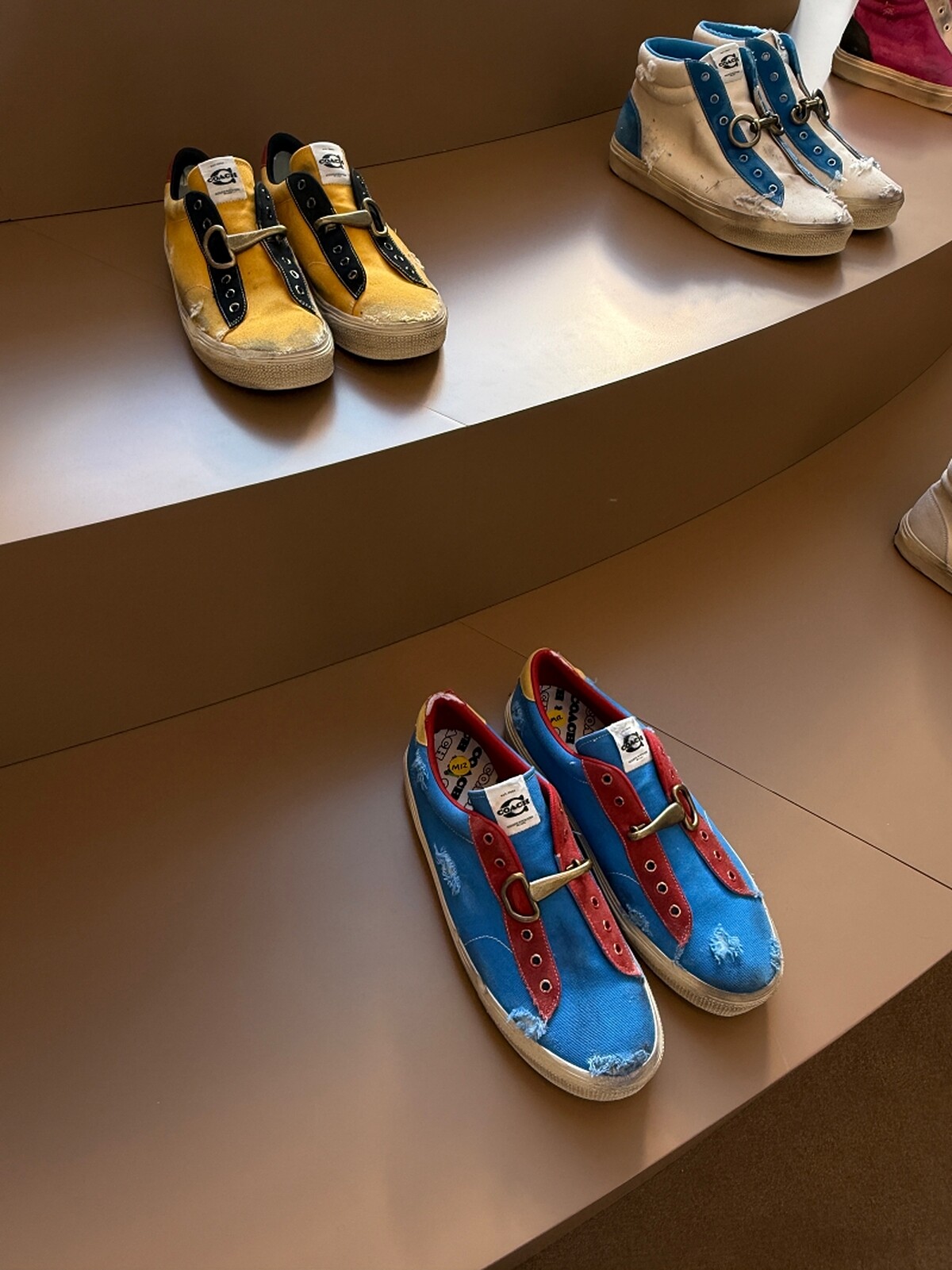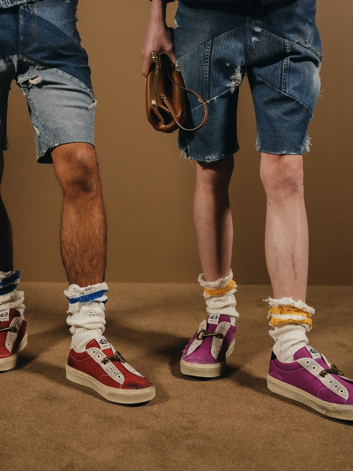 鞋履是這季最直接與年輕世代對話的單品,靈感源自1970美式街頭的滑板文化,無鞋帶的做舊帆布鞋身,搭配上鞋孔處的消防扣環或牽繩扣等金屬細節成為亮點元素,讓復古的美式街頭感帶著全新玩味。