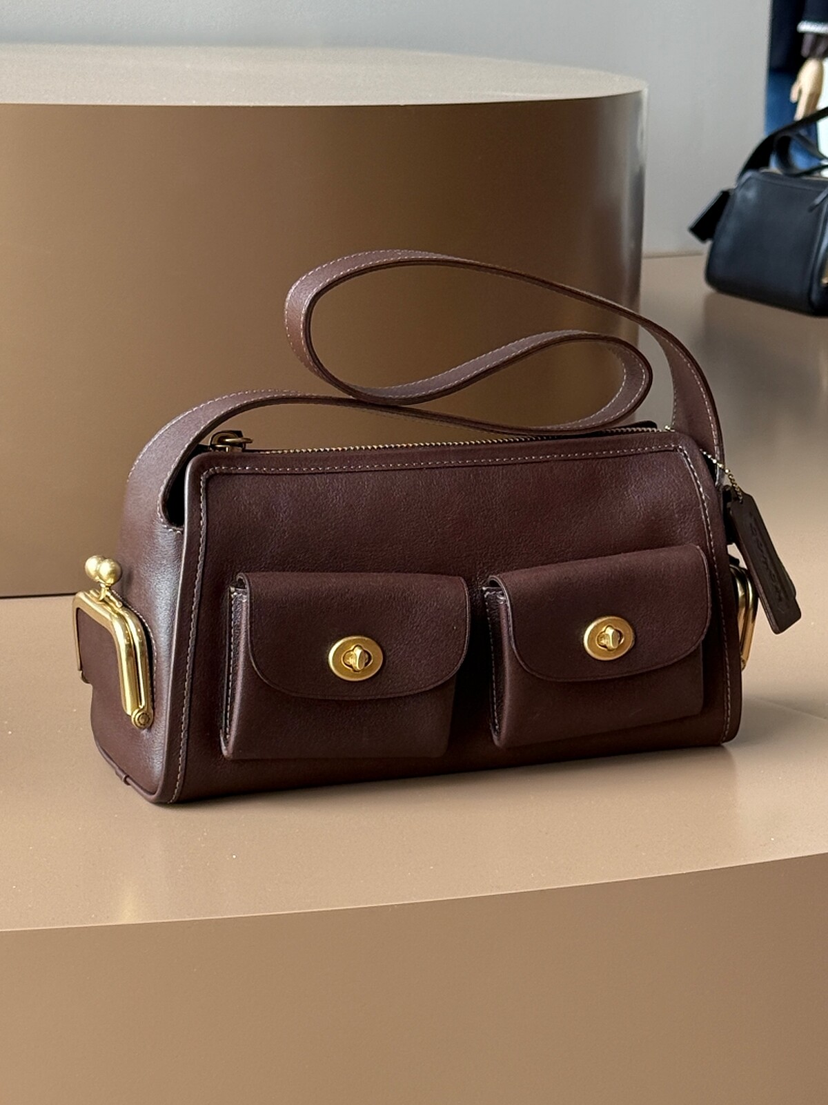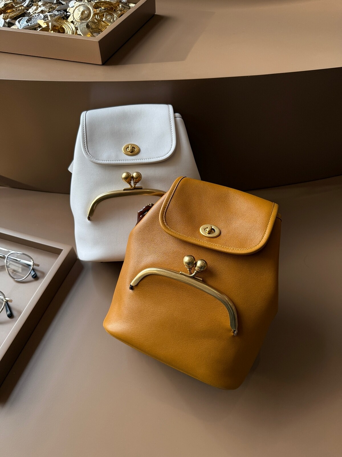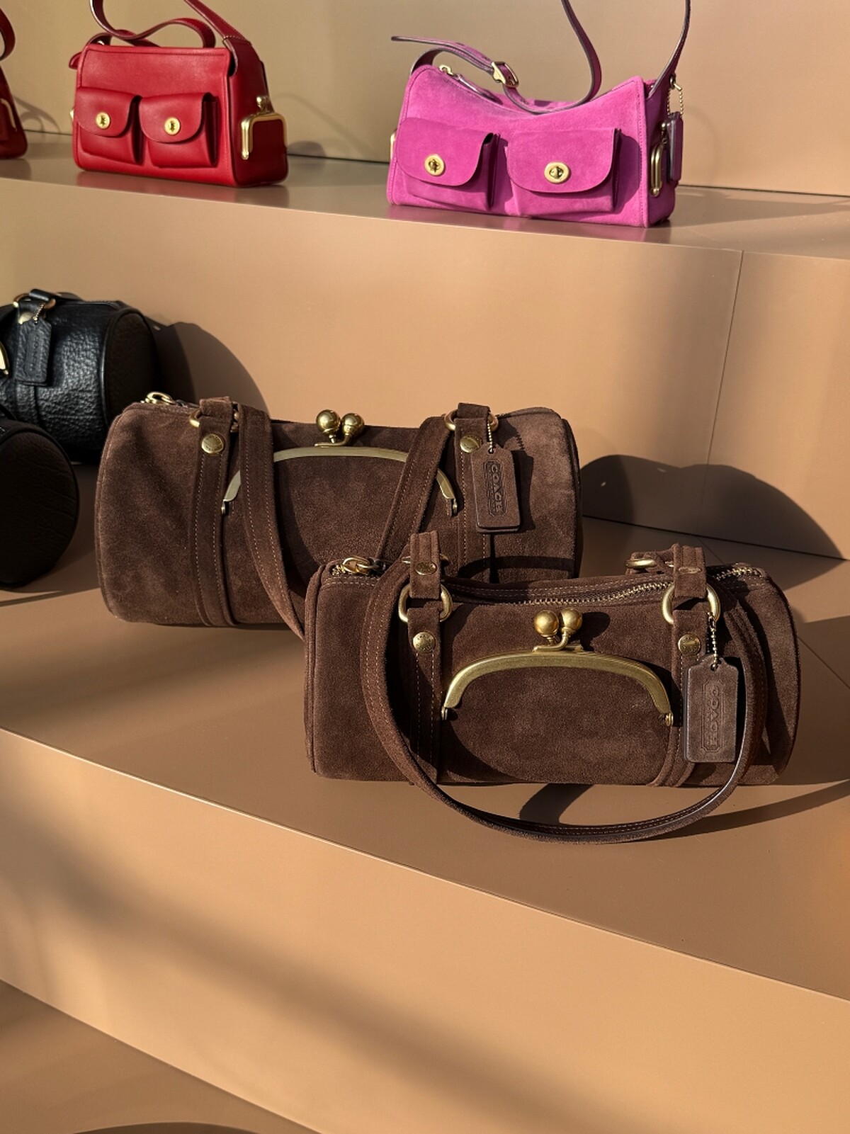 在Brooklyn、Carryall、Kisslock的陸續竄紅之下,手袋作為Coach近年表現非常亮眼的部分,在本季推出不少新鮮單品,其中比例變為修長的全新Kisslock Frame東西包更是其中的焦點之作,這款包作為單肩背的設計,在秀上模特兒以手抓包的方式呈現,推出杏色、楓樹棕與格紋羊毛等多種版本搶佔爆款C位,經典的Turnlock Haversack包型輪廓則略為加深,並搭配轉扣口袋與鎖扣夾袋,還有小型的Kisslock後背包,以及兩種尺寸的Turnlock郵差包。