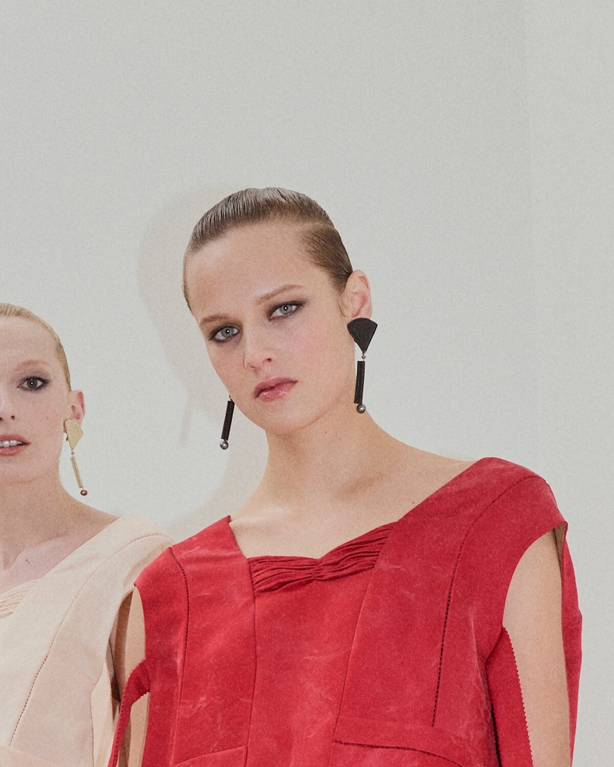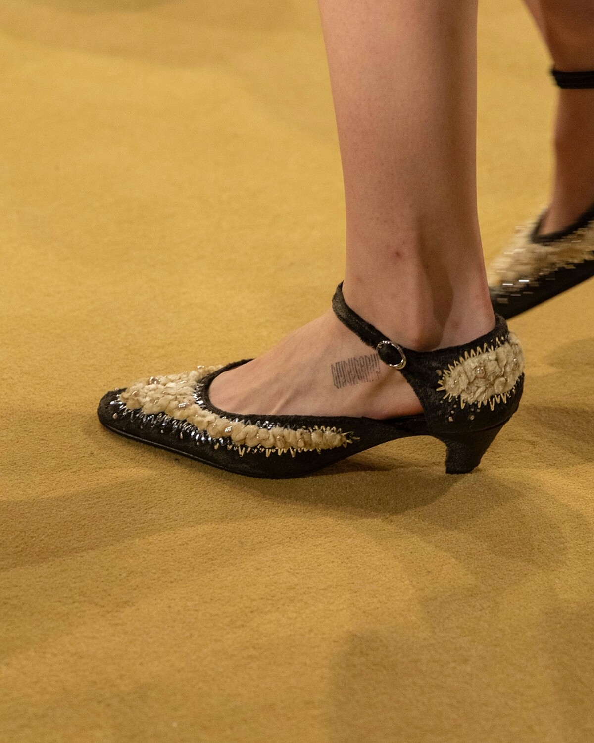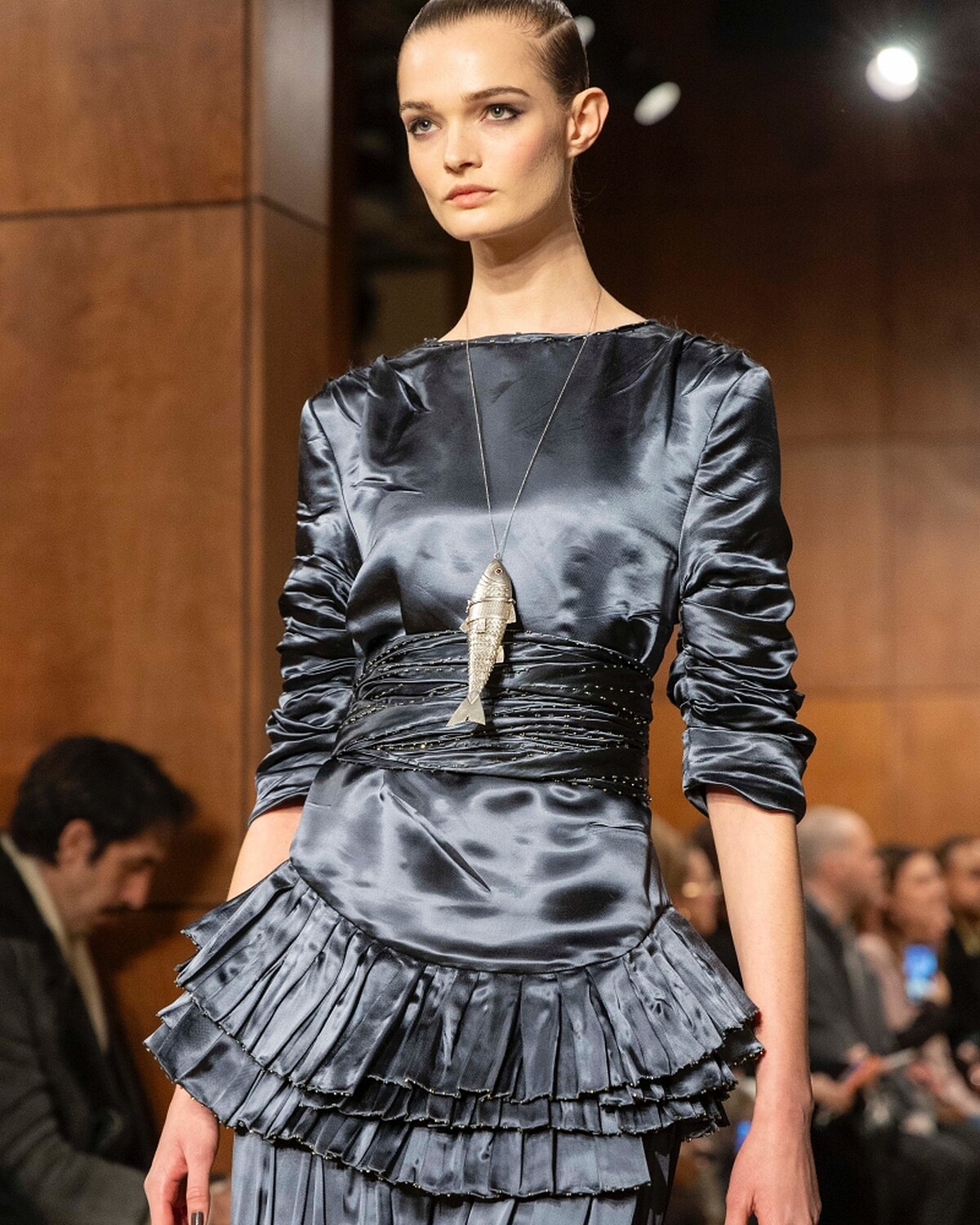 這一季還有一個細節——材質的衝突感,配飾以貝殼、火山岩珠飾、壓紋皮革、魚形吊墜與沙丁魚胸針這些元素,讓服裝在優雅之外,透過材質的互相映襯,多了一點有趣的反差,也讓造型看起來更有生活感。