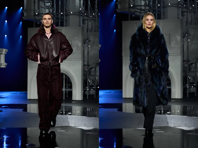 風衣依舊是核心,卻不再只是功能性的存在;它被重新賦予晚裝語境,與仿皮草飛行夾克、鋪棉皮革外套、厚重靴款與層次穿搭並行,構築出能夠應對夜雨、穿梭街頭、趕上夜班公車的都會輪廓。對 Lee 而言,這是一個關於「倫敦人如何毫不費力地穿衣」的系列,在黑白基調中穿插墨藍與深紫,讓服裝在實用之外顯得更精緻、更俐落,也更性感。這不再是鄉間週末或音樂祭草地,而是純粹的城市夜晚:衣服必須合理、必須耐用,同時也必須有魅力。