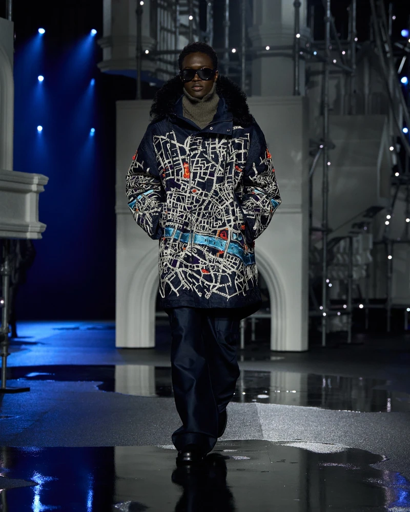 Lee 特別提及一款他最想親自穿上的設計,他將一張復古倫敦地圖直接織入布料之中。這張描繪泰晤士河蜿蜒穿過倫敦金融城的地圖,不僅出現在大秀邀請函上,也被印製於秀場嘉賓獲得的絲巾,成為品牌記憶與城市情感的具象延伸。