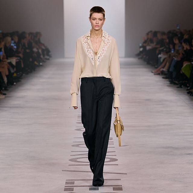 本季關鍵命題之一,是「回歸欲望,回歸身體」。在過度數位化與快速消費的背景下,設計師將衣櫥重新置於身體之下,而非凌駕其上。服裝不再是控制曲線的結構,而是順應本能、包容感官的存在。布料強調觸感與流動性,輪廓貼合卻不壓迫,使穿著者得以自在展現情緒與姿態。男女模特並肩行走於伸展台,模糊性別衣櫥的界線,讓「女性氣質」與「男性氣質」成為形容共享特質的語彙,而非對立分類。