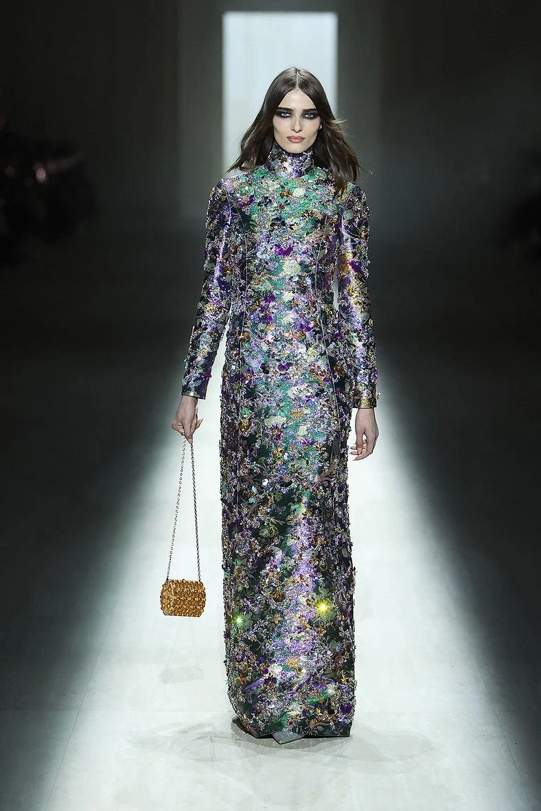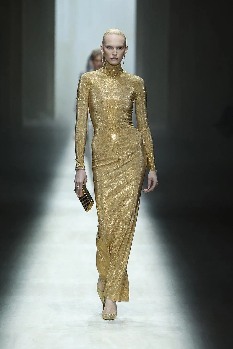 高衩禮服與迷你洋裝大膽延伸至腰際,最終形成高度討論的,無疑是那一件作為壓軸登場的露背禮服,隱約展露鑲嵌10克拉鑽石的白金GG丁字褲,將人體藝術與奢華符碼推向極致!