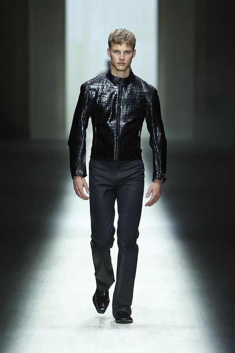 裝飾語彙強調視覺張力與雕塑感,奢華、古典又具先鋒氣質。蓬鬆羽毛刺繡自貼身泡泡夾克、飛行外套與嵌花羊皮外套間溢出,框住臉龐,強化戲劇效果。珍稀且富延展性的柔軟皮革,被運用於騎士外套、貼身長褲與環形披肩之上,兼顧包覆性與舒適度。整體造型靈感來自古典雕像比例,塑造出如 Adonis 般的理想身形,呼應文藝復興時期對人體曲線與平衡的崇尚。