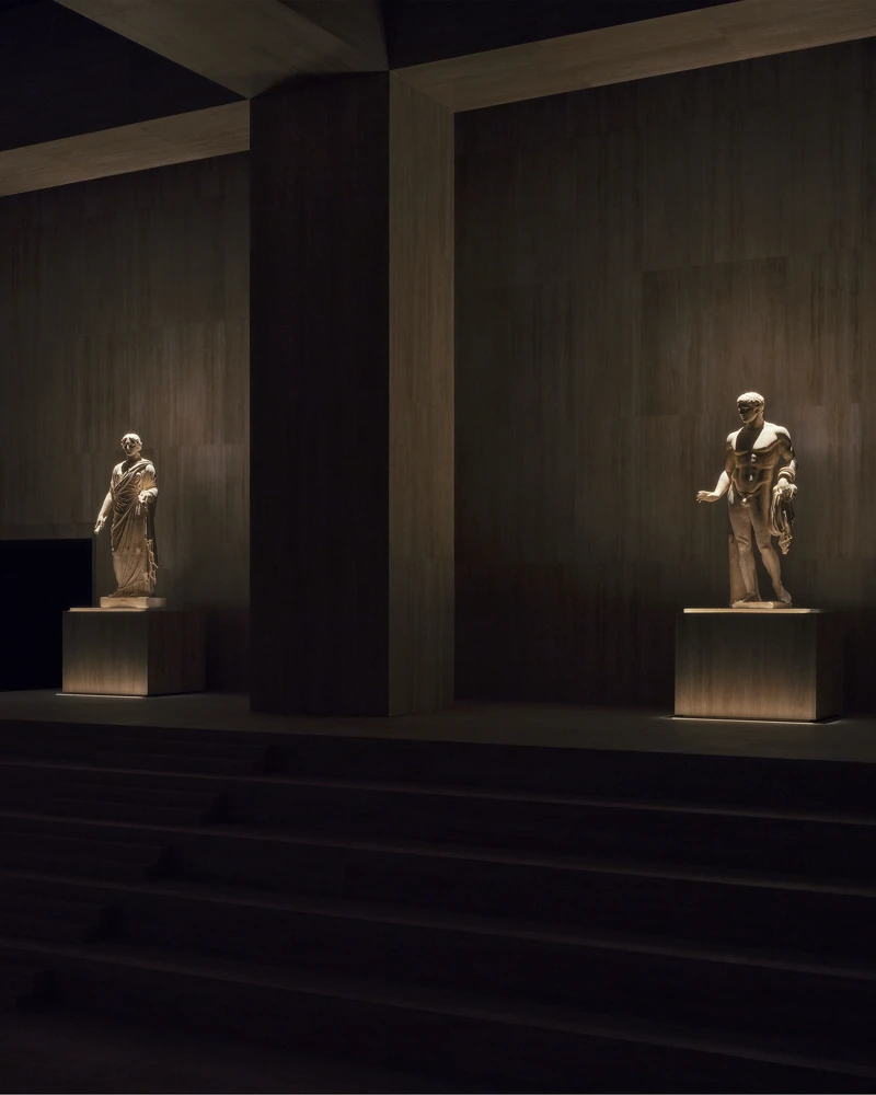 秀場空間宛如博物館般莊嚴,四周環繞大理石雕像,象徵設計者對這座時裝之家的理解與敬意。音樂由 Loki 精選五種截然不同的曲風交錯編排,在衝突與融合中形成統一的聲音語彙,呼應系列所倡議的多元共存。