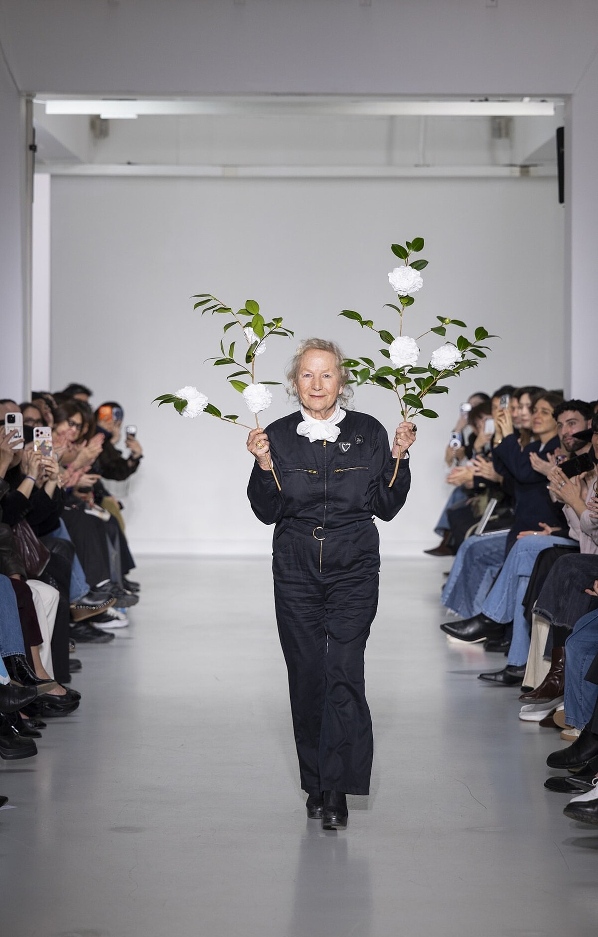 服裝秀尾聲,以 agnès b. 標誌性的經典畫面收束,身著婚紗的新人模特兒壓軸登場。隨後,模特們依序步上階梯站定,彷彿一幅靜靜展開的畫面。而當 Agnès 步入場中央謝幕時,全場掌聲響起,也為這場描繪都會女性日常風景的服裝秀,畫下安靜而篤定的句點。
