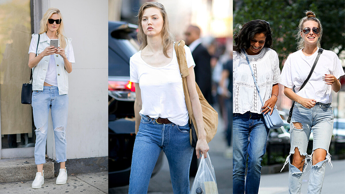 白T Shirt與牛仔褲的組合是想也不用想,最簡單的穿搭方式,但時髦與落漆只有一線之隔,當你身上的單品如此簡單時,請多花點時間在細節處,除非你身材比例超好,腿超長,不然T Shirt下擺請好好處理,像名模Lindsey Wixson(中)這種要紮不紮的隨性感,或是巴西名模Caroline Trentini(左)直接綁起一個小節並露出一點腰部曲線,都是大家該做筆記的小細節。