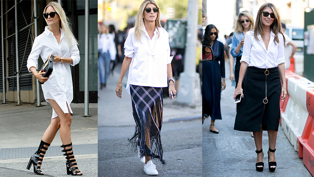最後怎麼能忘了白襯衫,這件最基本款卻也是最經典、最容易搭配的時尚恩物,每個女孩的衣櫥裡都應該準備很多件,無論是寬鬆長版可以當作洋裝穿著,或是寬版襯衫表現街頭混搭的穿搭概念,或者像前美國版美麗佳人時尚總監Nina Garcia(右),以合身白襯衫穿出優雅品味,都是炎夏裡的穿搭必備品項。