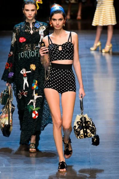 胸衣設計與高腰短褲的很有復古味,是今年夏天最熱門的款式,高腰剪裁的褲子能有效修飾小腹和腰線,有些上衣還具有馬甲集中托高功能,修身功能超強的。