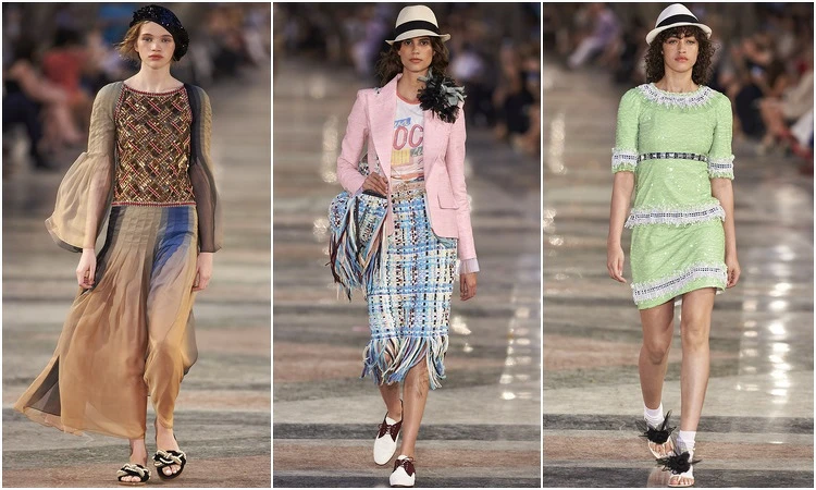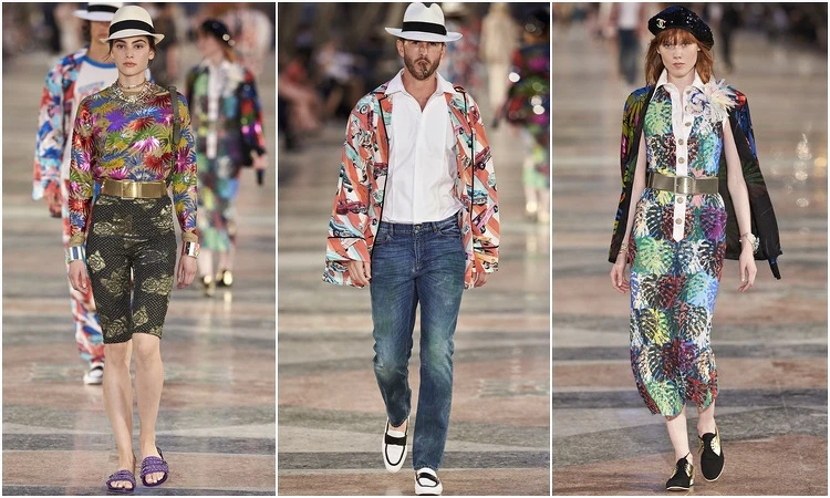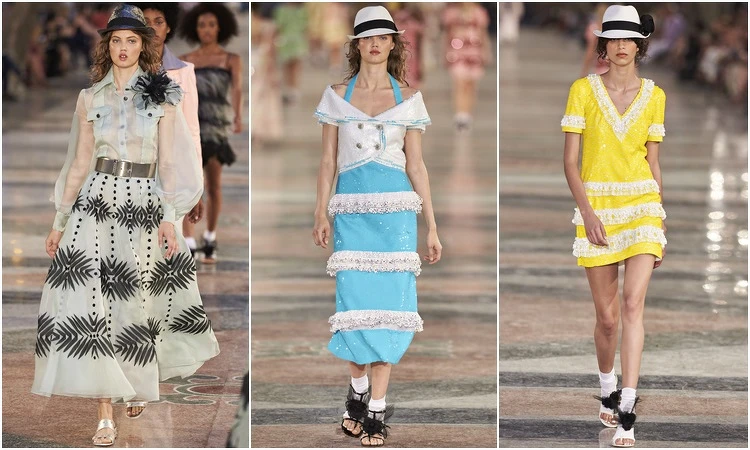 服裝秀由古巴裔法國女聲雙人組 Ibeyi 現場演唱揭開序曲,超模 Stella Tenant 身穿經典黑白褲裝、頭戴巴拿馬草帽率先登場,接著,幾套工藝精彩的優美造型陸續現身,清一色搭配平底鞋,以優雅而率性的姿態帶出加勒比海的度假氣息。正當我們納悶著古巴元素在哪兒的時候,叼著雪茄的男模步上大道,瀟灑氣質讓人眼睛為之一亮;女模則換上淡雅的襯衫配上植物印花蓬裙,流露宜人的愜意氛圍;軍綠色拼接外套與各式丹寧設計,則搭配刻意不收邊處理的紅色斜紋軟呢長裙或經典外套,再背上大大的帆布包,展現旅人的輕鬆與隨意;經典軟呢套裝更是與印有彩色字樣的T恤混搭,顯得年輕又活潑;極重要的工坊工藝則表現在葉片鏤空網紗、印染鏤空手工蕾絲、立體花朵刺繡與密鑲亮片彩色刺繡上,讓度假風格也能展現精湛工藝;而一系列古巴個性鮮明的古董車印花和鮮豔的荷葉緄邊洋裝,更是將服裝秀帶入最高潮。末了,在古巴傳統樂團的現場演出下,Model 群出謝幕,領著所有人邊唱邊跳離開秀場,搭古董車前往派對現場繼續狂歡。