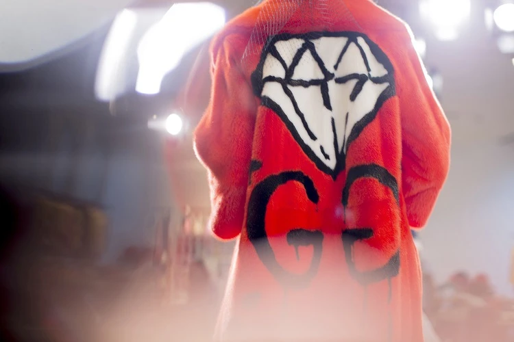 幾年前的某個萬聖節深夜,Andrew 將一條仿冒 Gucci 大毛毯披在身上,挖了兩個洞好露出眼睛後便跑到街上對著路人大喊:「Gucci Ghost 來了!」玩上癮的他自此在紐約的地下道、商店鐵門、紅磚牆面甚至街角垃圾車等處,任意噴上自行發想的 Gucci Ghost 與變形的雙G塗鴉,甚至還延伸出各種服飾與音樂專輯。本身就是個次文化愛好者的 Michele 輾轉得知 Andrew 所為後,不僅沒有任何不悅,甚至大膽邀請他聯手創作,將原本只是街頭惡搞的 Gucci Ghost 送上真正的伸展台。從做工精細的刺繡外套、矜貴的皮草大衣、浪漫的傘狀圓裙到雅緻的提包,全都在 Gucci Ghost 恣意流竄下換上我行我素、蔑視世俗的新面貌,恰巧和 Alessandro Michele 的新古馳精神不謀而合。