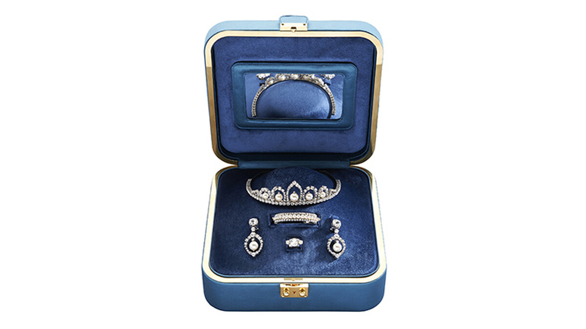 童話般浪漫的水藍色珠寶盒,以天鵝絨布料上的優雅飾品,寵愛著做著公主夢的你。
