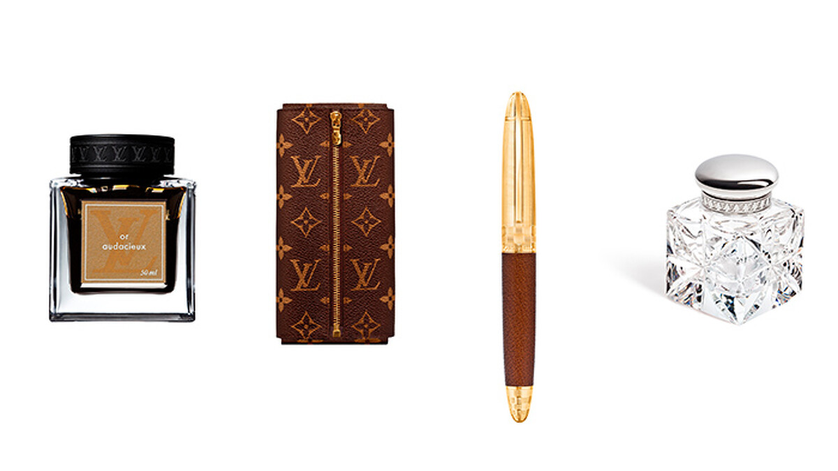 水晶墨水瓶、金色墨水、Monogram 筆袋、Sprit 滾珠筆,all by Louis Vuitton,NT42,000、NT1,700、NT15,300、NT36,000。