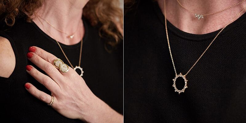 A:今天戴的飾品都是來自 Hearts on Fire。有三葉項鍊,這意味著我的家人,很像隨時陪伴在我身邊一樣。Eclipse,則是月蝕,也時時刻刻提醒我要堅強、要開心,時常保持笑容。