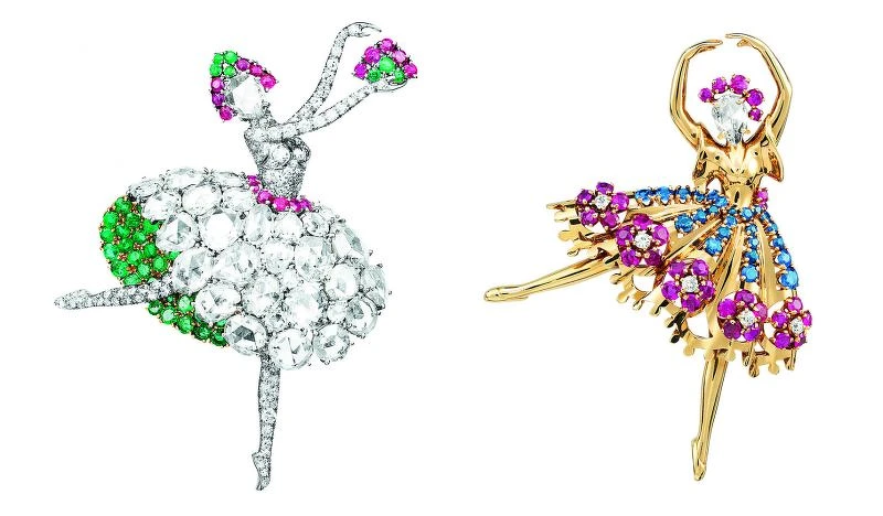 Van Cleef & Arpels 另外一個重要的設計元素,是芭蕾舞伶與仙子。首批舞伶胸針出現在1940年代,靈感來自品牌創始人之一 Louis Arpels 對舞蹈的熱愛;不論是芭蕾舞伶與童話仙子,其雕細琢的梨形臉龐,髮飾、腰帶、裙襬,各以寶石或對比或點綴,非常討人喜歡。