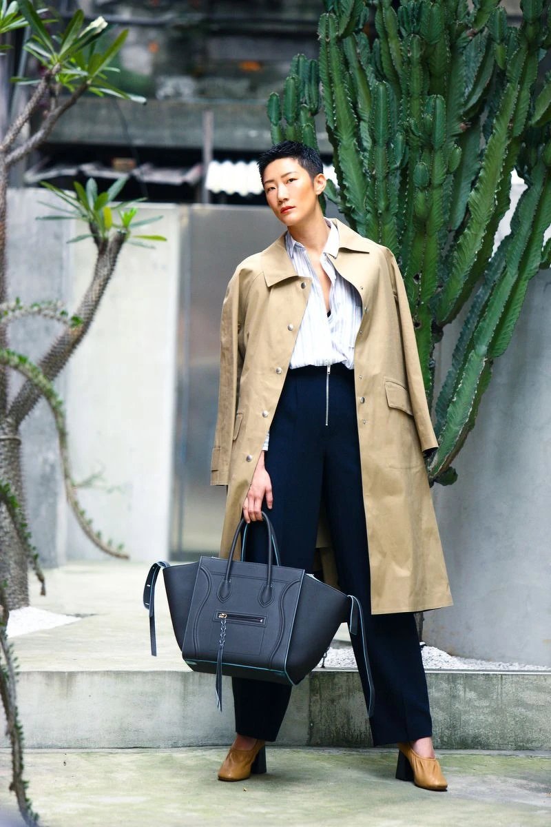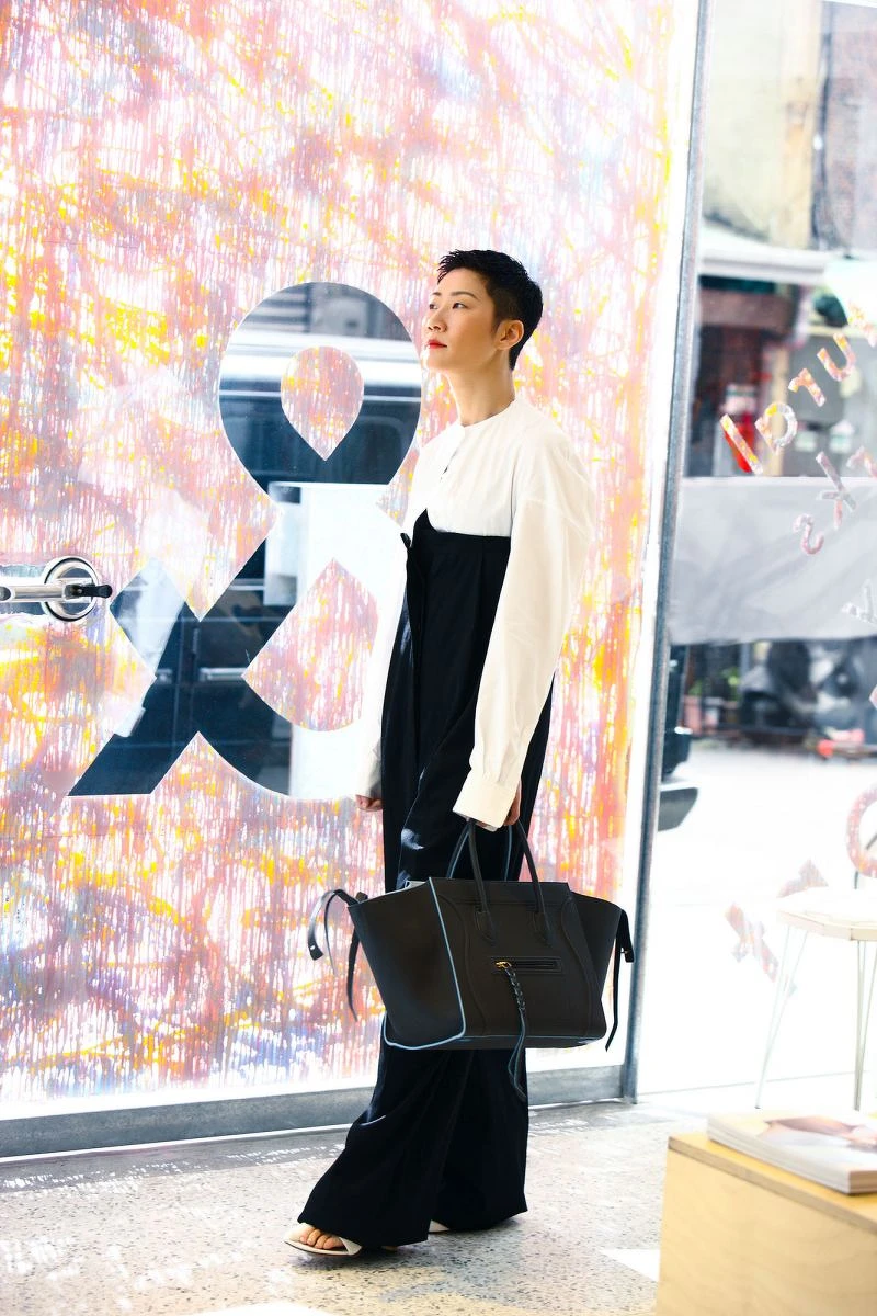 在她黑、白、灰、深藍四色的衣服主體裡,她喜歡經典且隨性的穿著;「我不太跟著流行走,但會參考當季的細條,找到適合自己的東西。還好現在時尚也很多元,還是有很多選擇,像CÉLINE的服裝與包款,就是我喜愛經典+舒適的其中一種選擇。」對自己常以較中性的裝扮出現,她說:「只是因為舒服。」她表示自己懶,這樣的裝扮行動比較自在,她坦承也經歷過波希米亞風、板妹風的階段,後來才底定風格,在正式場合她還是會穿裙子,不過她笑:「我沒法淑女太久。」