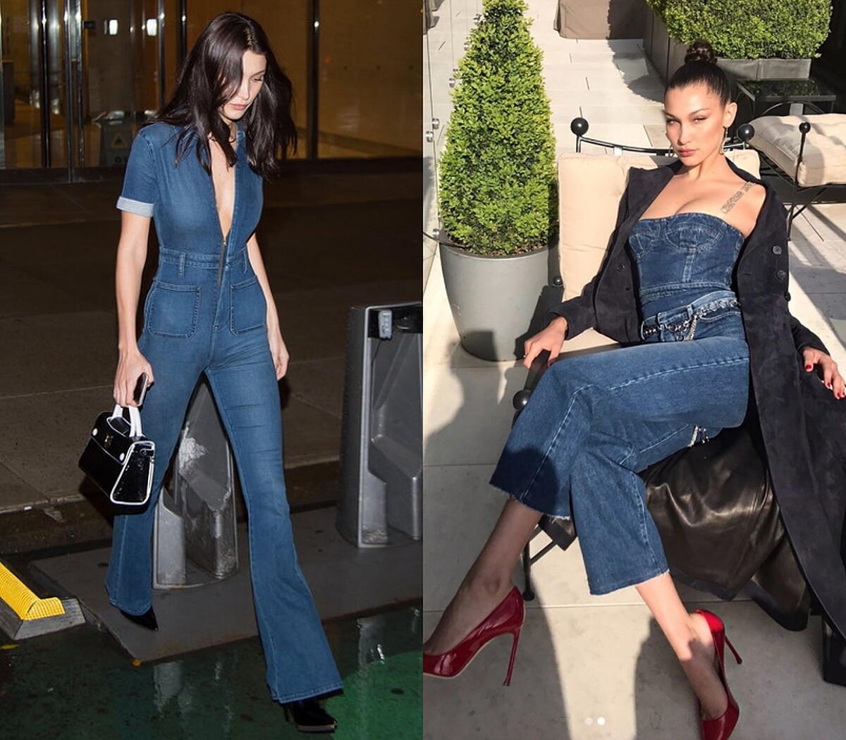 跳脫工人感的丹寧連身褲,不管是開岔至腰部或是平口設計,皆顯出Bella Hadid完美的胸線與性感鎖骨,搭配上的亮漆鞋款及包為造型增添了一筆摩登韻味!