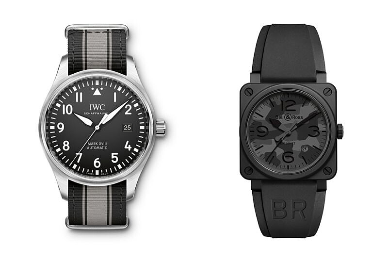 (右) BR 03-92 Black Camo 腕錶,彩色陶瓷錶殼,錶款以航空儀錶為靈感,Bell & Ross。