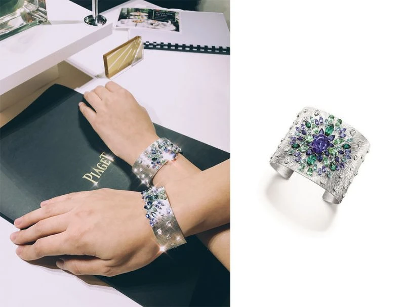 Piaget Society標誌性的Manchette寬版手鐲上巧妙搭配藍寶石、坦桑石與藍綠色碧璽,環繞著一顆8克拉的橢圓形切割坦桑石層疊羅列;有趣的是藏於側邊小鑽後方是以三點固定,可以精妙的拆為一對細手鐲,佩戴於左右腕!