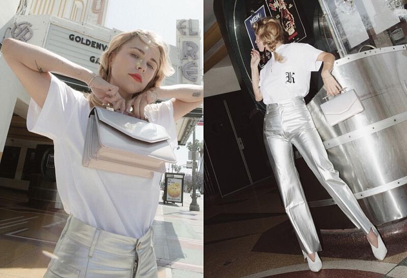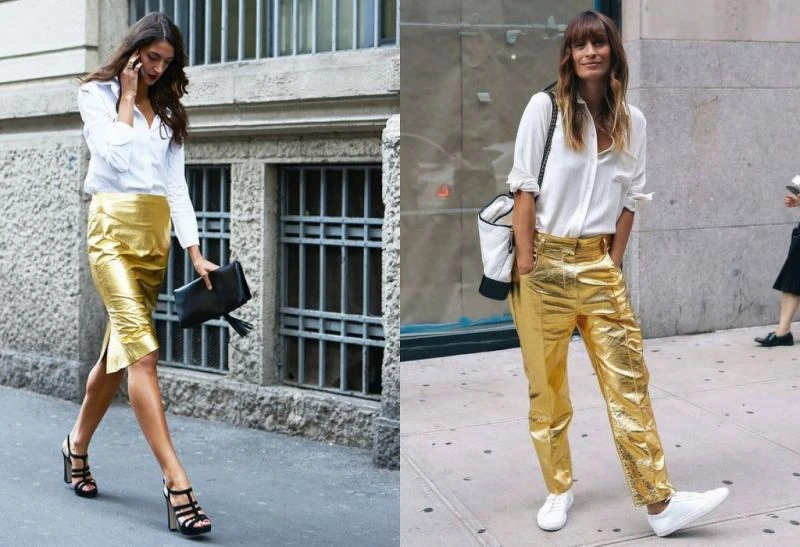 同樣都是襯衫,同樣都是搭配金屬單品,卻呈現出不同風情。窄身裙注入了成熟韻味,中高腰褲帶出了休閒的中性調,此時上身的白巧妙地總和大面積金屬色的高調,成為日常穿搭中的選擇之一。