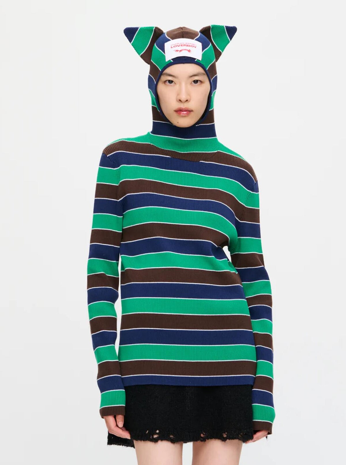 以叛逆、次文化風格著稱的英國品牌Charles Jeffrey Loverboy,其動物耳朵設計的帽飾最為出名,而這回品牌將巴拉克拉法帽與毛衣相連,把撞色的綠、藍、棕色條紋,配上立體耳朵,也算是一件搶眼的聖誕裝扮了!