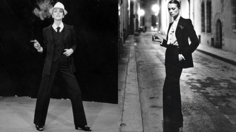 1967年YSL春夏高定秀場上,聖羅蘭先生將男裝元素運用到女裝裡,黑色禮服套裝、白襯衫、領結、禮帽,這些帶有男性風格的設計被當時的時尚界稱為「菸裝 (Le Smoking) 」。