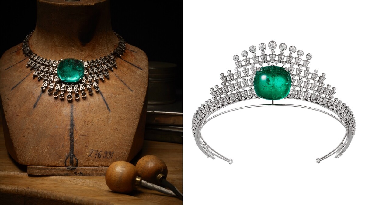在Cartier工坊,能被稱作「頂級珠寶」,不只有它極致瑰麗的主石、出色的創意概念與大師技藝,更意指世上僅此一件、絕無僅有的珍稀難得!像是「Hyperbole」這件作品,中央鑲嵌主石約140克拉的哥倫比亞祖母綠,從中心鮮綠色的明亮色彩,到外緣精美細膩的藍綠色,有著絕美的立體感;可用作冠冕或項鍊配戴的多重形式,更增添收藏價值。