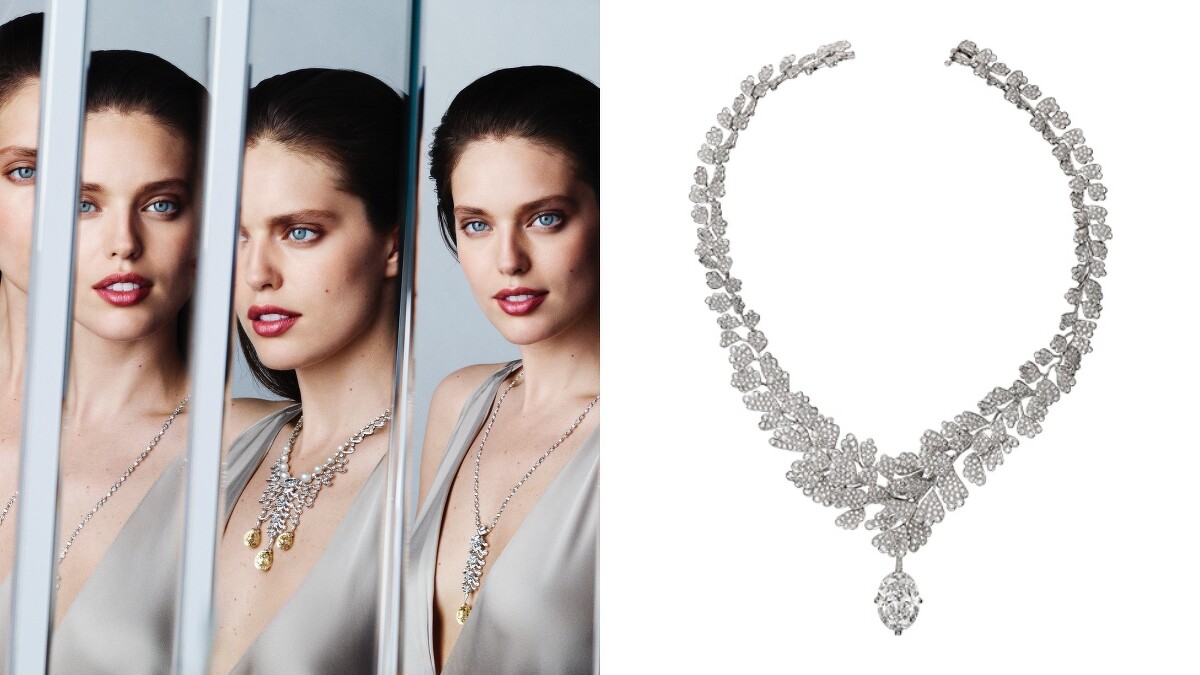 纖細的根莖和蒼翠的葉片,鐵線蕨是Adiante(前鋒)鑽石項鍊的構圖主題,從側面看過去,由鉑金打造的一片片精緻葉片錯落有致的排出立體感,若從正面仔細欣賞,在每一片葉片上,精巧鋪鑲了圓形明亮式切割鑽石和玫瑰式切割鑽石,營造出細微有層次的晶瑩透亮,就像是滴滴露珠從葉柄上懸垂而下,最終再匯集凝結成中央的20.04克拉鑽石。