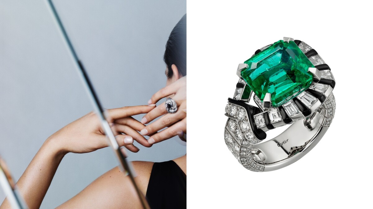 黑色縞瑪瑙與耀目鑽石形成黑白鮮明對比,輔以簡約明快的方與圓形圖案,City Road鑽石縞瑪瑙耳環,是有著濃濃裝飾藝術風格,卻又展現節奏、動感、張力的作品;Green Boucle(綠色腰帶)祖母綠戒指的八角形切割尚比亞祖母綠、縞瑪瑙、梯形切割鑽石、圓形明亮式切割鑽石的鑲嵌運用,以及顯眼的黑、綠、白搭色,呈現Cartier的經典色彩組合。