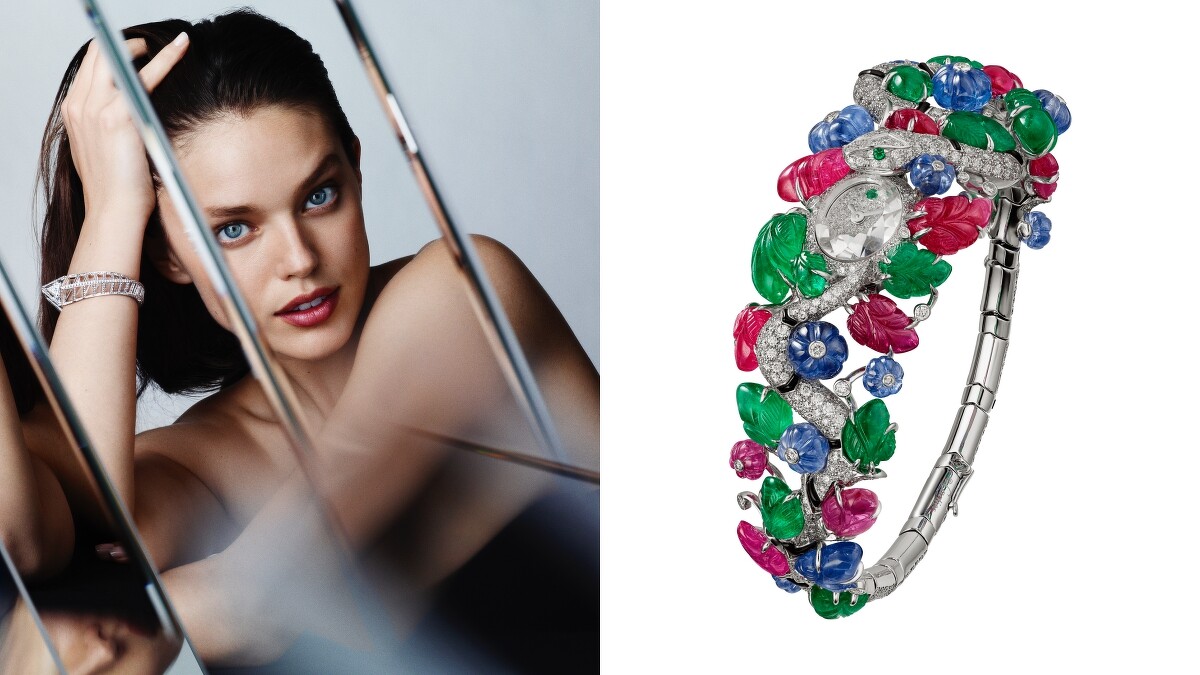 雕刻紅寶石、祖母綠和藍寶石的設計組合—Tutti Frutti是Cartier自1920年代以來的美學象徵,在每一年度全新頂級珠寶主題中,它總不會缺席。這只全新的蛇形造型珠寶錶,以具象的形式來呈現,它彎曲的身體環繞著手腕,頭與尾巴盤繞於錶盤之上,是 Cartier以現代詮釋手法,為Tutti Frutti所帶來的新鮮感。