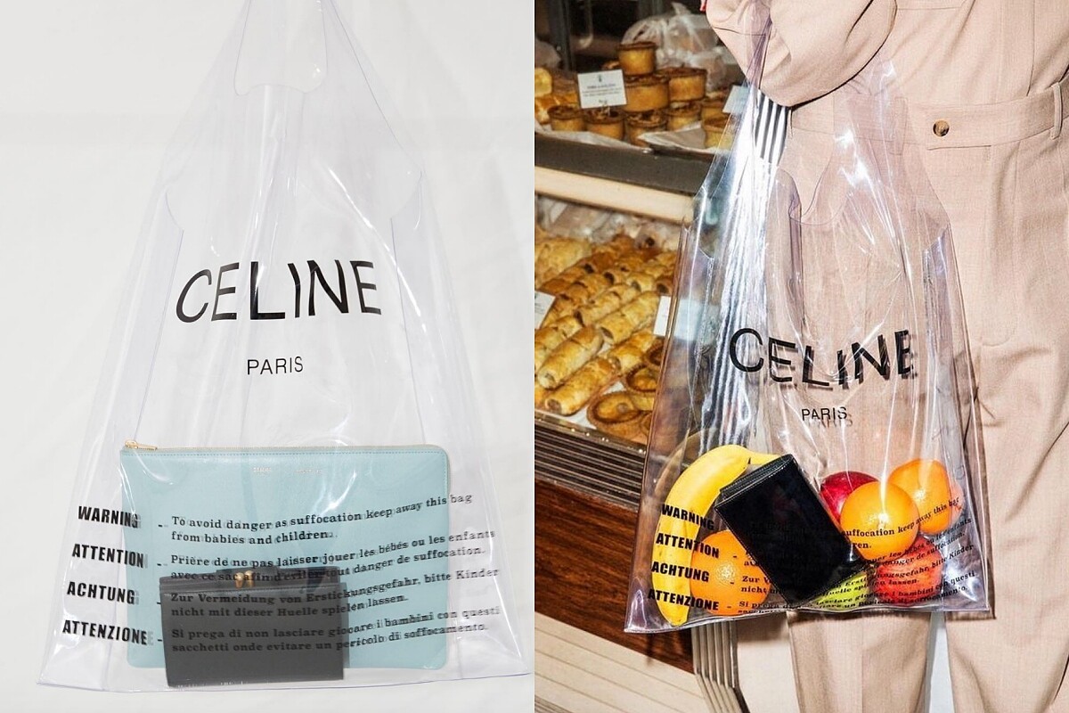 如果要談是誰掀起這波塑料風潮的話,那麼CÉLINE的這款透明塑料手提袋絕對是主要的原由之一。這款包主打的其實是袋中的小羊皮中夾,殊不知跟著皮夾一起販售的“只送不賣”透明袋竟然比皮夾更受歡迎,成為人人皆想擁有的夢幻逸品,無疑是當今最搶手的購物袋!設計上除了印有大大的品牌字樣,下方的四國語言則訴說著:「為避免造成窒息,務必遠離嬰幼童。 」的貼心幽默字語。