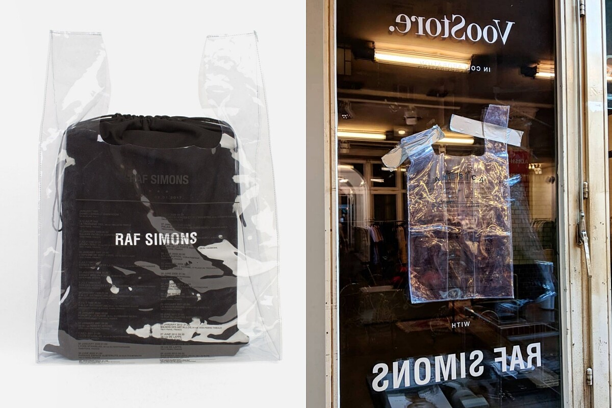 去年底柏林時尚概念店Voo Store特別邀請了Raf Simons參加品牌的年度設計師活動,推出的聯名商品正是紅透半天的透明塑膠手提袋!設計上為了呼應正面印有的「 America Tour 」,背面則印上品牌至今於美國舉辦時裝秀的日期及地點,如有興趣購買的你們也不仿參考品牌將附贈的防塵袋置入透明袋中,成為兼具時髦、重複利用與收納性的包款。