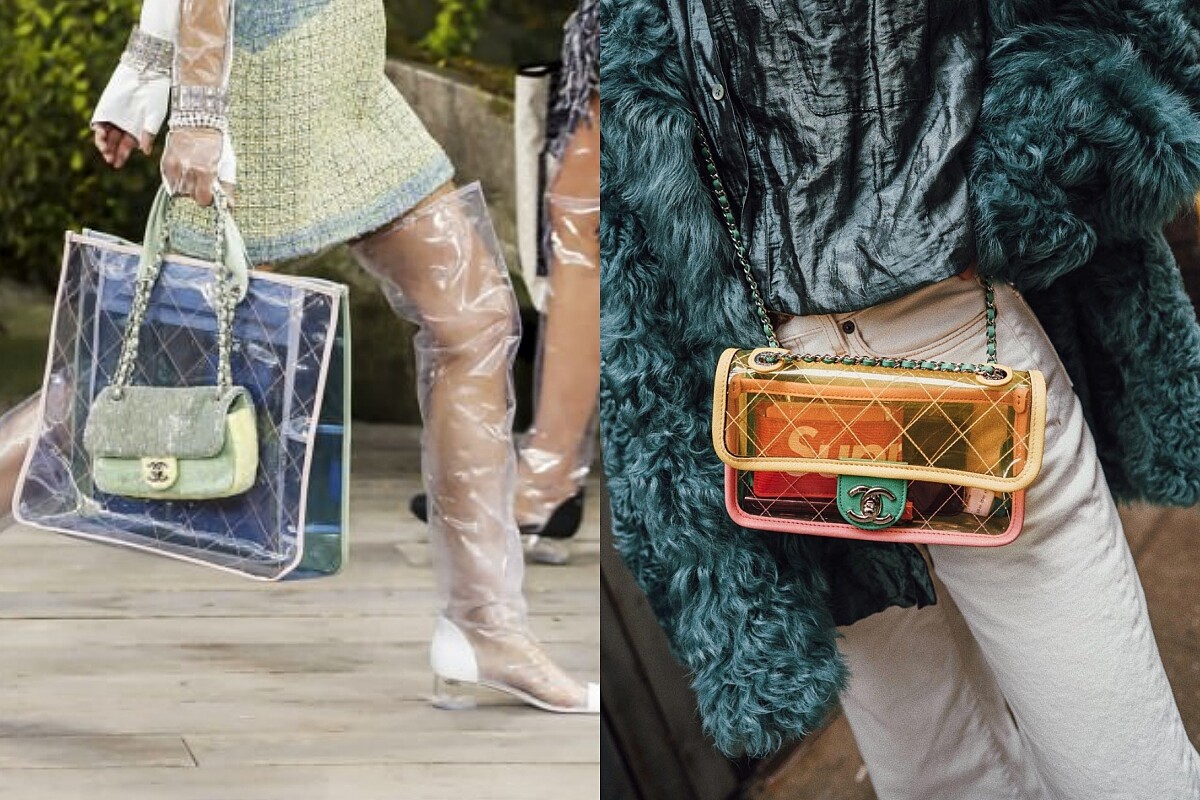 今年的春夏時裝週上Chanel將大量的塑料材質用於設計上,不分衣服、鞋子、包包、或配飾,都可看見那清澈的透視美角,特別的是,除了一般的無色透明,也有摻加了馬卡龍色的粉嫩選擇,夢幻的配色完全是夏日裡的吸睛亮點物!