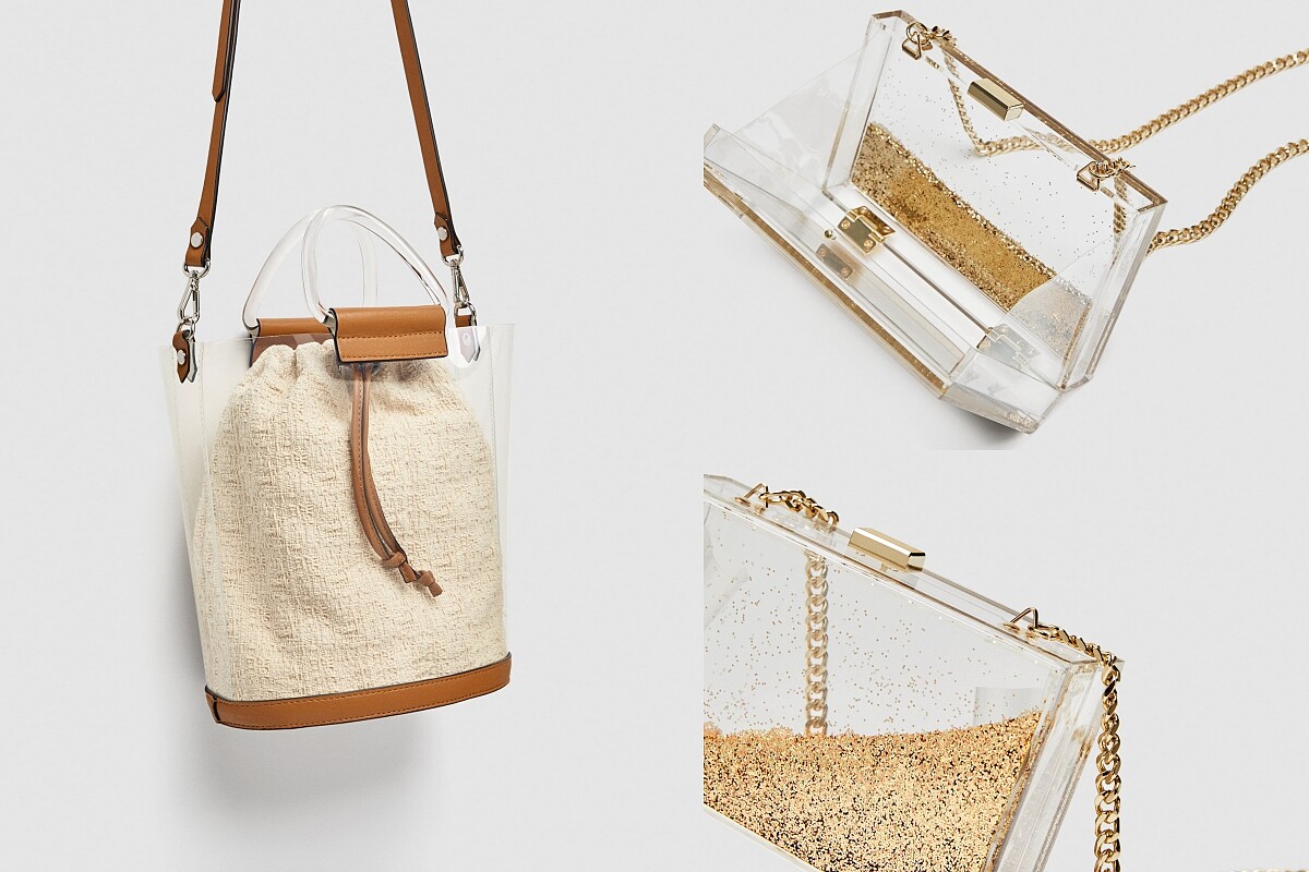 或許是感受到PVC材質的風潮威力,快時尚品牌Zara也趁勢推出了幾款透明服飾,其中像是適合夏日度假的水桶包,袋中的棉麻束口包則替外表甚至收納性加乘不少; 又或是將具有液態流動感的亮粉幻化在硬殼鍊帶包上,帶來既趣味又璀璨的吸睛亮點。