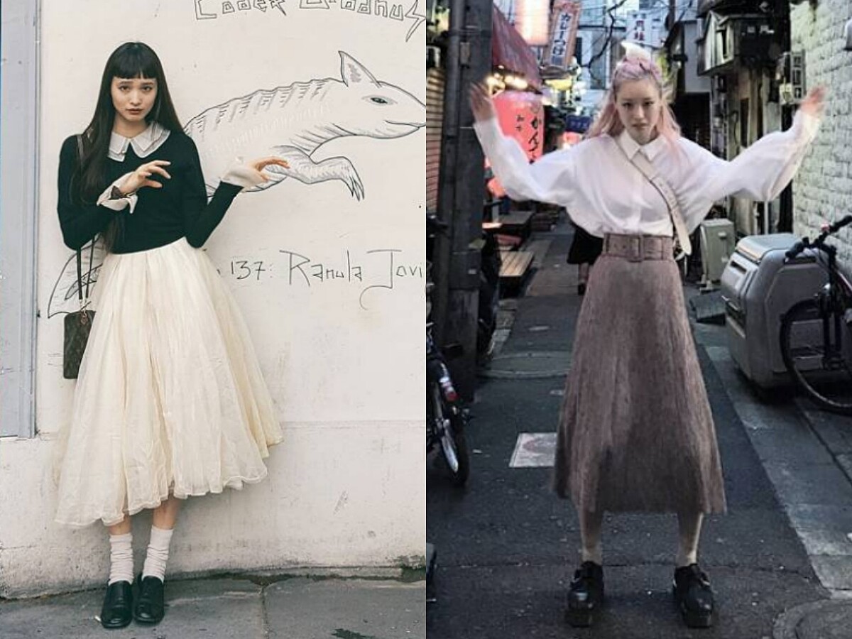 充滿日系風的學生裝扮也是兩位二次元少女熱愛的造型款,除了必備的彼得潘領,一件飄逸感的長裙才能注入浪漫的注目氛圍,當然經典的泡泡襪和厚底鞋也是不可少的主搭配配飾喔!