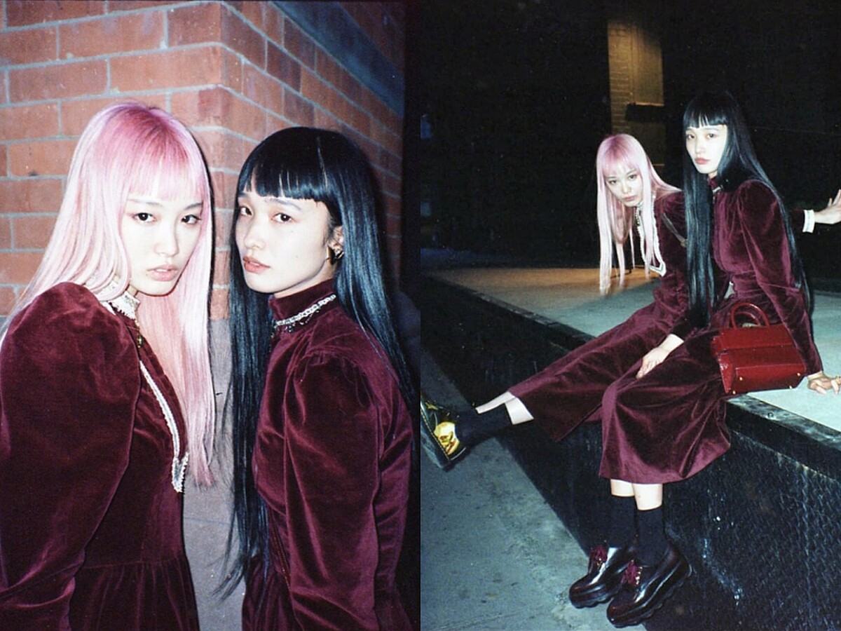 酒紅色的醇厚色調配上奢華感的絲絨面料,再搭上兩人於領部裝點的宮廷領與珠寶頸鍊,塑造出彷彿來自二次元世界的奇異夢幻少女。