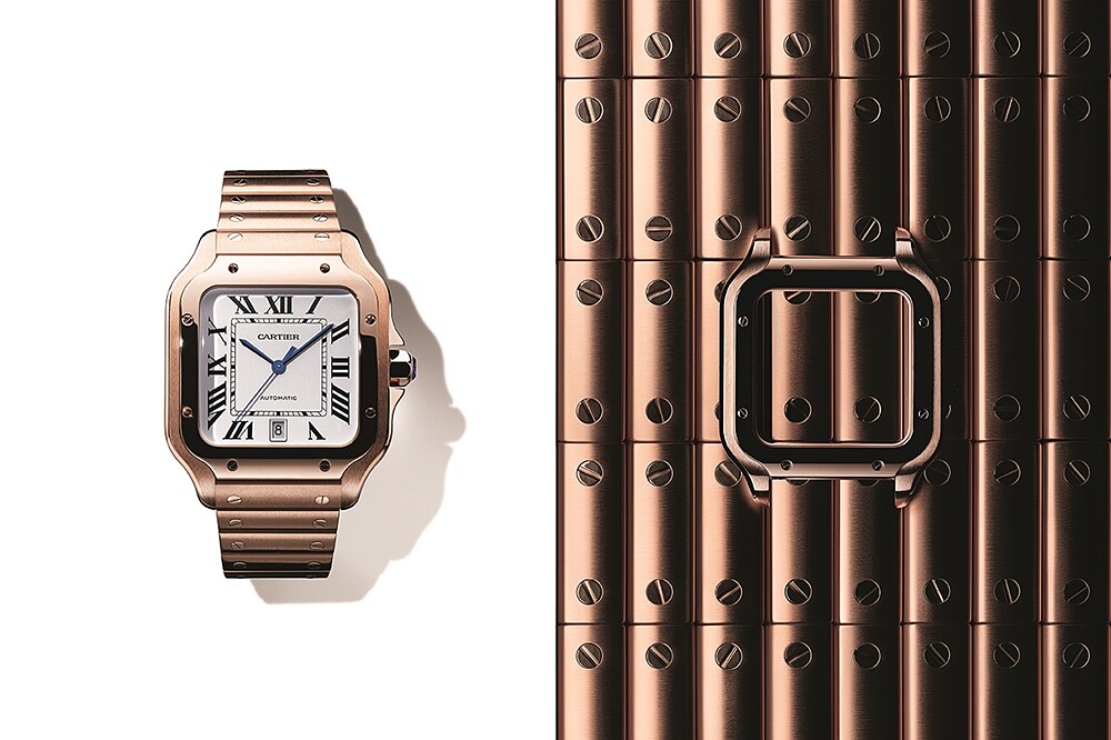 Santos de Cartier最大的設計風格就是它筆直搶眼、簡潔對稱的輪廓,背後的靈感來自艾菲爾鐵塔的四角外型,錶圈的八個外露螺絲裝飾,宛如都市建築微型縮影的趣味結構,展現獨樹一格的摩登風情。